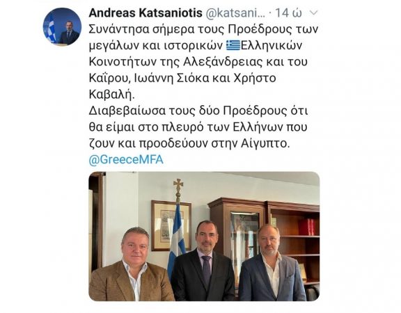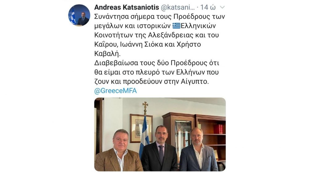 Την πρώτη τους συνάντηση είχαν στις 16 Σεπτεμβρίου στην Αθήνα, στο Υπουργείο Εξωτερικών, οι Πρόεδροι των Ελληνικών Κοινοτήτων Αλεξανδρείας και Καΐρου, Ιωάννης Σιόκας και Χρήστος Καβαλής, […]