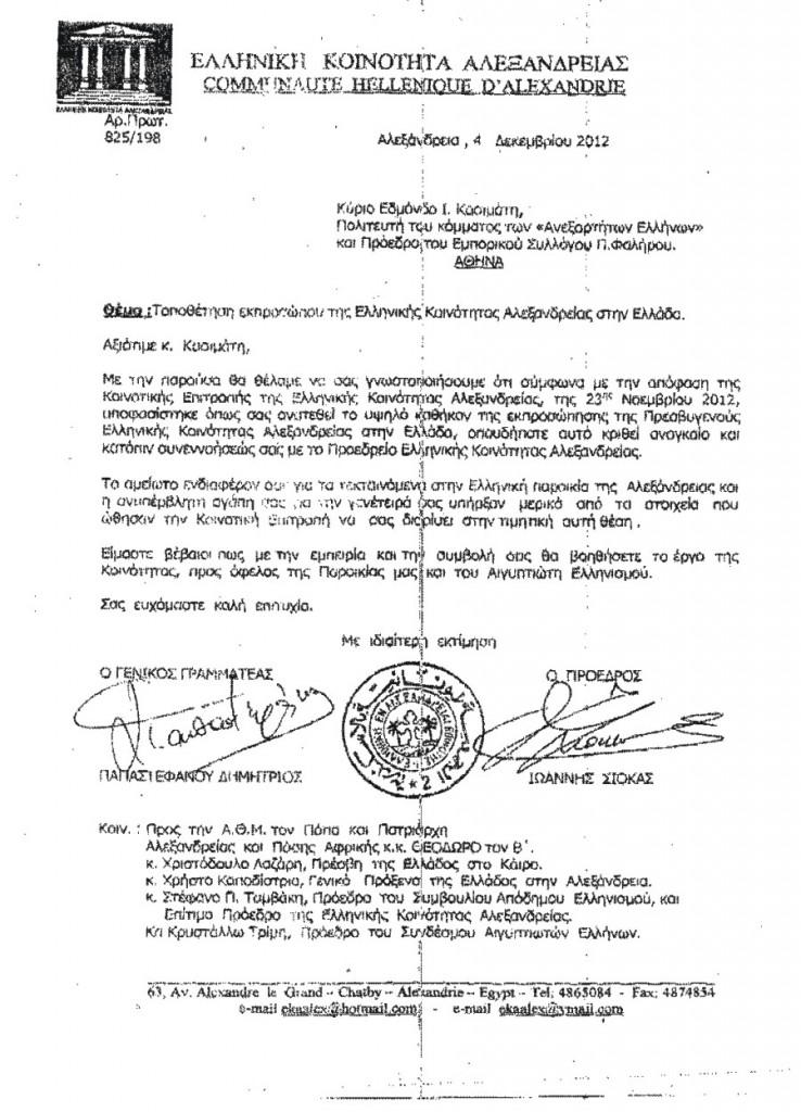 Η απόφαση της Κοινοτικής Επιτροπής της Ελληνικής Κοινότητας Αλεξανδρείας (βλέπε αντίγραφο επιστολής) καταλήγει ως εξής: