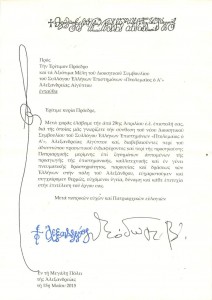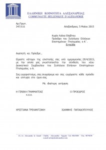 Συγχαρητήριες επιστολές προς το νέο Δ.Σ. του Συλλόγου Ελλήνων Επιστημόνων Αλεξανδρείας «Πτολεμαίος Α’» απέστειλαν τόσο η ΑΘΜ ο Πάπας και Πατριάρχης Αλεξανδρείας και πάσης Αφρικής κ.κ. Θεόδωρος ο Β’, όσο και η Ελληνική Κοινότητα Αλεξανδρείας.