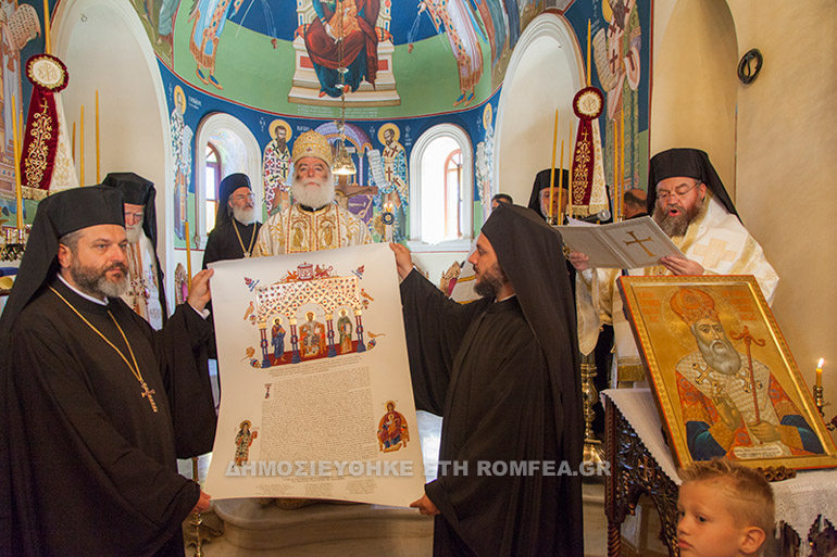 Τρισάγιο Θεό και την Παναγία Μητέρα Του, την «Ορφανή», Έφορο και Προστάτιδα της Μονής, για όλα τα δώρα και τις ευλογίες του Ουρανού στο διάβα της ζωής Του και παρέδωσε προς τον Σεβ. Αρχιεπίσκοπο Κρήτης κ. Ειρηναίο τo πατριαρχικό Σιγίλλιο με την Συνοδική Πράξη αγιοκατατάξεως του Αγίου Προκατόχου Του Κυρίλλου του Λουκάρεως Πάπα Αλεξανδρείας και μετέπειτα Πατριάρχου Κωνσταντινουπόλεως, ο οποίος ήταν αδελφός της Μονής Αγκαράθου και εις εκ των τεσσάρων Πατριαρχών που έλκουν την πνευματική καταγωγή εκ της ως άνω Μονής και εκλέισαν τον Αλεξανδρινό Θρόνο.