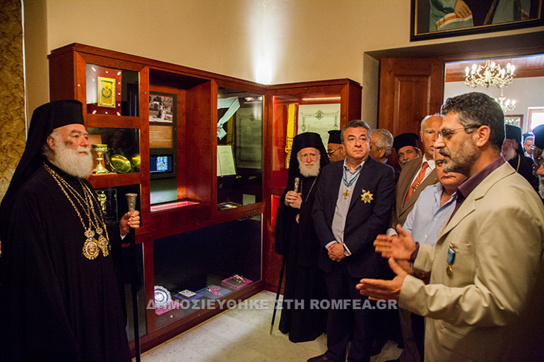 Τέλος, ο Μακαριώτατος αναγνωρίζοντας το έργο, το ήθος, την προσφορά και τη φιλευσέβεια του εντιμολ. κ.Σταύρου Αρναουτάκη, Περιφερειάρχου Κρήτης, φροντίδι του οποίου εγένετο η εν λόγω Αίθουσα, τον περικόσμησε με τον Ανώτερο Ταξιάρχη του Λέοντος του Τάγματος της Αλεξανδρείας.