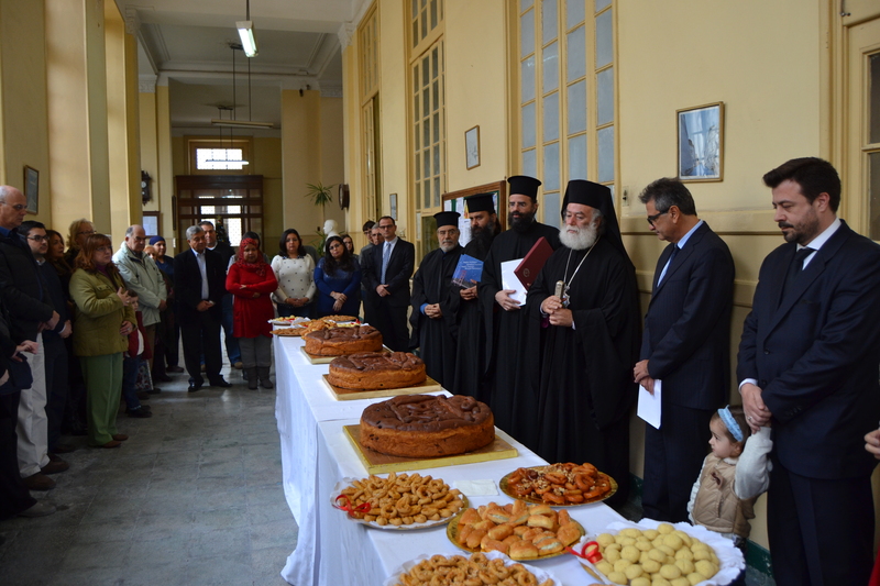 Η εκδήλωση ξεκίνησε με την ευλογία του Μακαριωτάτου, ο οποίος στο λόγο του αναφέρθηκε στο πολύ σημαντικό έργο που επιτελεί η Ελληνική Κοινότητα Αλεξανδρείας. Παράλληλα αναφέρθηκε στο έργο του Πατριαρχείου αυτήν τη δύσκολη εποχή και σημείωσε την πεποίθηση του ότι το 2016 θα αποτελέσει έτος ελπιδοφόρο με αλλαγή προς το θετικότερο της κατάστασης ανά την υφήλιο. Στη συνέχεια ο Μακαριώτατος προσέφερε στον Πρόεδρο της Ε.Κ.Α. κ. Παπαδόπουλο μία εικόνα του Αγίου Γεωργίου και ένα ημερολόγιο. Ο Γενικός Πρόξενος κ. Κακαβελάκης στο χαιρετισμό του αναφέρθηκε στη σημασία της παρουσίας των Ελλήνων στην Αλεξάνδρεια και στο γεγονός της συνεργασίας που θα πρέπει να υπάρξει ανάμεσα στο Πατριαρχείο, στην Ε.Κ.Α. και το Προξενείο για το καλό της Κοινότητας. Ο Πρόεδρος της Ελληνικής Κοινότητας Αλεξανδρείας κ. Ιωάννης Παπαδόπουλος στο χαιρετισμό του ανέφερε: “Με ιδιαίτερη χαρά σας καλωσορίζω σήμερα εκ μέρους και