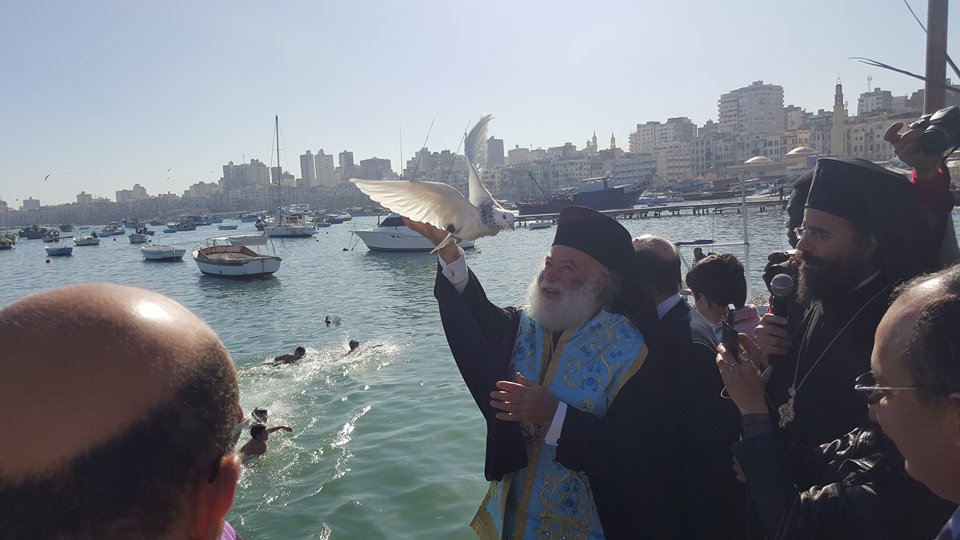 Το μεσημέρι η Α.Θ.Μ. προεξήρχε της τελετής του Αγιασμού των Υδάτων στον Ελληνικό Ναυτικό Όμιλο Αλεξανδρείας. Μαθητές των ελληνικών εκπαιδευτηρίων της πόλεως βούτηξαν στα παγωμένα νερά του ανατολικού λιμένα της Αλεξάνδρειας για να ανασύρουν τον Τίμιο Σταυρό. Προς αυτά ο Μακαριώτατος προσέφερε την ευλογία Του, ως και πολύτιμα αναμνηστικά δώρα.
