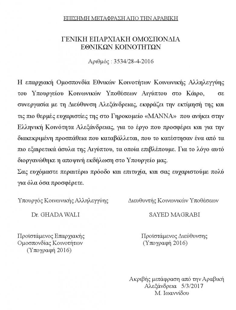 “Η επαρχιακή Ομοσπονδία Εθνικών Κοινοτήτων Κοινωνικής Αλληλεγγύης του Υπουργείου Κοινωνικών Υποθέσεων Αιγύπτου στο Κάιρο, σε συνεργασία με τη Διεύθυνση Αλεξάνδρειας, εκφράζει την εκτίμησή της και τις πιο θερμές ευχαριστίες της στο Γηροκομείο «ΜANNA» που ανήκει στην Ελληνική Κοινότητα Αλεξάνδρειας, για το έργο που προσφέρει και για την διακεκριμένη προσπάθεια που καταβάλλεται, που το κατέστησαν ένα από τα πιο εξαιρετικά άσυλα της Αιγύπτου, τα οποία επιβλέπουμε. Για το λόγο αυτό