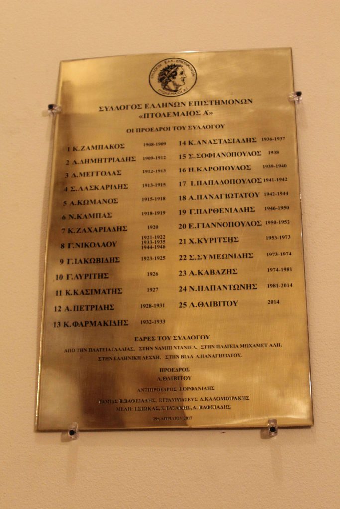 “Ο Γενικὸς Πρόξενος της Ελλάδος στην Αλεξάνδρεια κύριος Εμμανουὴλ Κακαβελάκης και ο Πανοσιολογιώτατος Πατήρ Δανιὴλ Μπιάζης ως εκπρόσωπος του Μακαριωτάτου Πάπα και Πατριάρχου Αλεξανδρείας και πάσης Αφρικής κυρίου Θεοδώρου Β ́, έκαναν τα αποκαλυπτήρια αναμνηστικής τιμητικής ορειχάλκινης πινακίδας η οποία περιλαμβάνει τα ονόματα των είκοσι πέντε (25) Προέδρων του Συλλόγου, απὸ την αρχὴ της λειτουργίας του, κατὰ το 1908, έως σήμερα. Η πινακίδα τοποθετήθηκε στην κεντρική αἰθουσα των δεξιώσεων του Συλλόγου, παράλληλα με φωτογραφίες των Προέδρων του Συλλόγου.