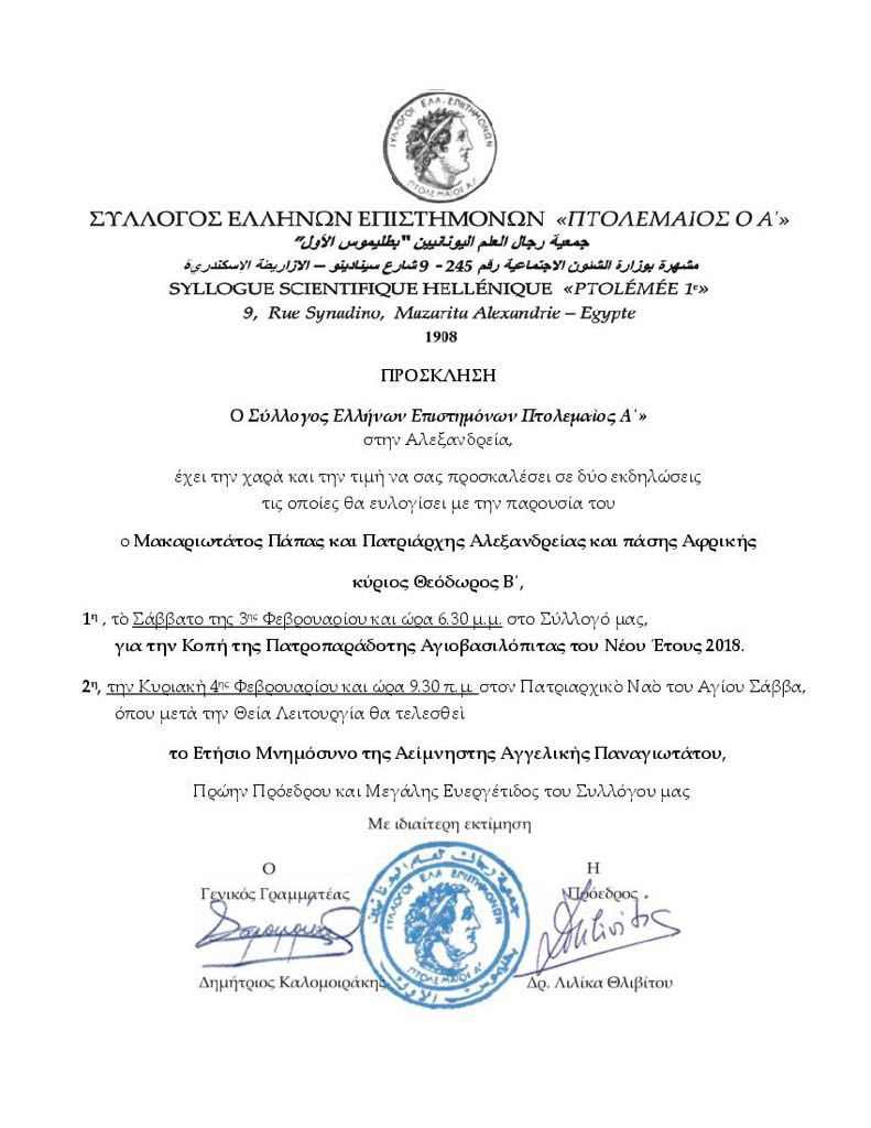 Παράλληλα, την προηγούμενη ημέρα το απόγευμα, το Σάββατο 3 Φεβρουαρίου και ώρα 6.30 μ.μ., ο Σύλλογος θα κόψει την πατροπαράδοτη αγιοβασιλόπιτα για το 2018, που θα ευλογήσει ο Αλεξανδρινός Προκαθήμενος, στο χώρο του Συλλόγου.