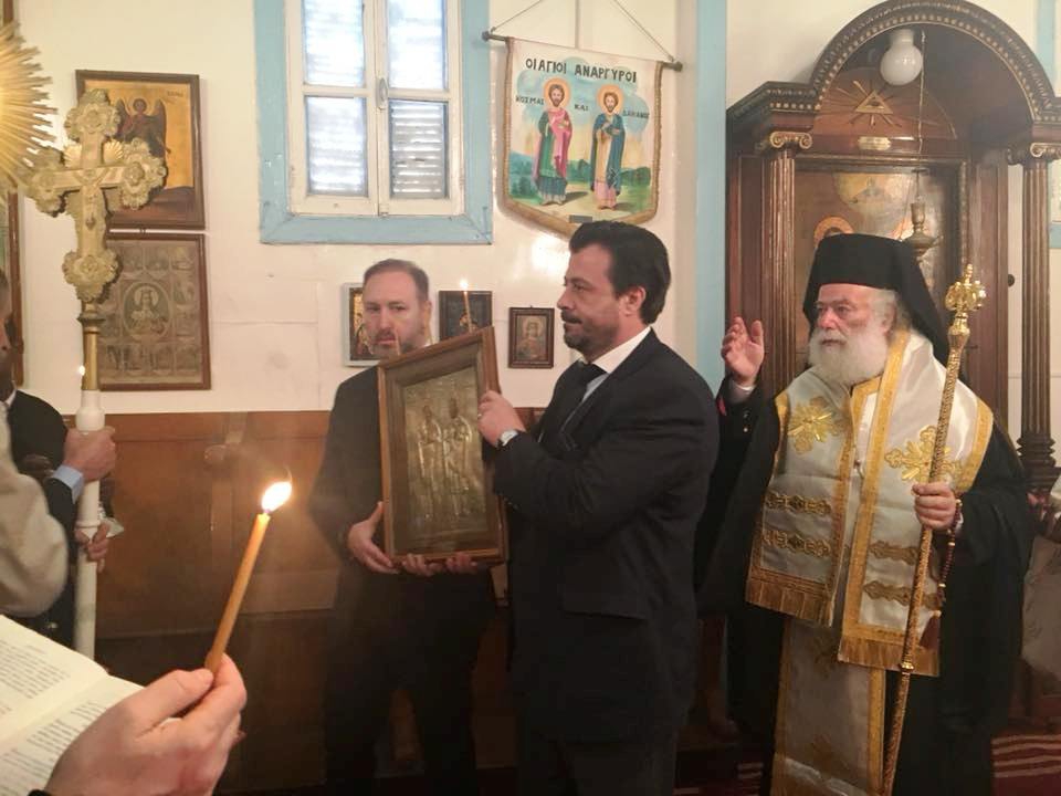 Ακολούθησε λιτανεία της εικόνας των Αγίων Αναργύρων, της εκκλησίας που τόσο φρόντισε όσο βρισκόταν στη ζωή ο αξιαγάπητος «Γιατρός», που αυτές τις μέρες κλείνουν τρία χρόνια από τότε που μας εγκατέλειψε για πάντα.