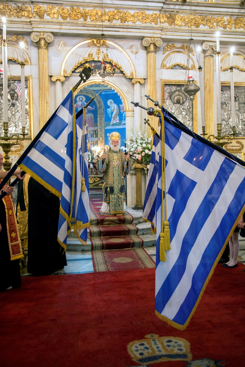 Σε κλίμα συγκίνησης, με τις ελληνικές σημαίες να κυματίζουν στον επιβλητικό πανηγυρίζοντα ναό του Ευαγγελισμού της Θεοτόκου της Ελληνικής Κοινότητας Αλεξανδρείας, τον μεγαλύτερο ελληνικό ναό στην ομογένεια της Αφρικής, ο Προκαθήμενος του Δευτερόθρονου Πατριαρχείου κ. Θεόδωρος έψαλλε το «Τη Υπερμάχω», μαζί με όλη την παροικία, στην Δοξολογία που πραγματοποιήθηκε παρουσία κόσμου, μαθητών, προσκόπων και πολλών επισήμων, κατά την Δοξολογία για την Εθνική εορτή της 25ης Μαρτίου.