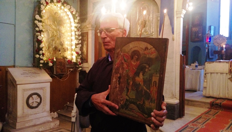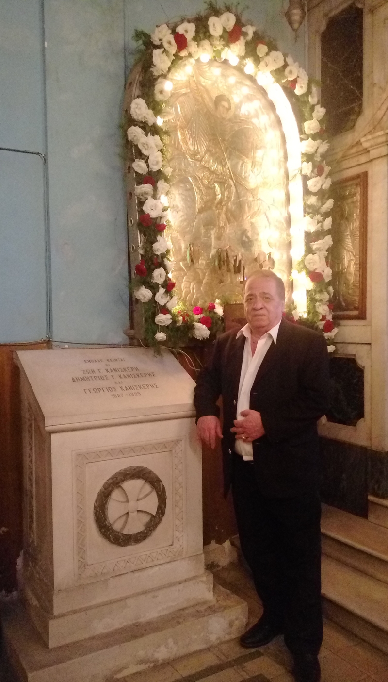 Συγκινητική και η εικόνα του οστεοφυλακίου του αείμνηστου Γεώργιου Κανισκέρη δίπλα ακριβώς από τη στολισμένη εικόνα του Αγίου Γεωργίου αλλά και η συγκίνηση του (επίσης εορταζόμενου) Γιώργου Δήμα κατά τον ασπασμό της.