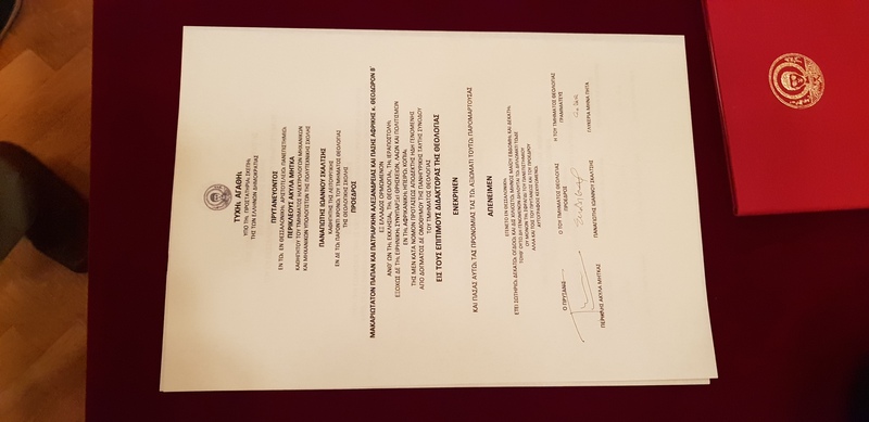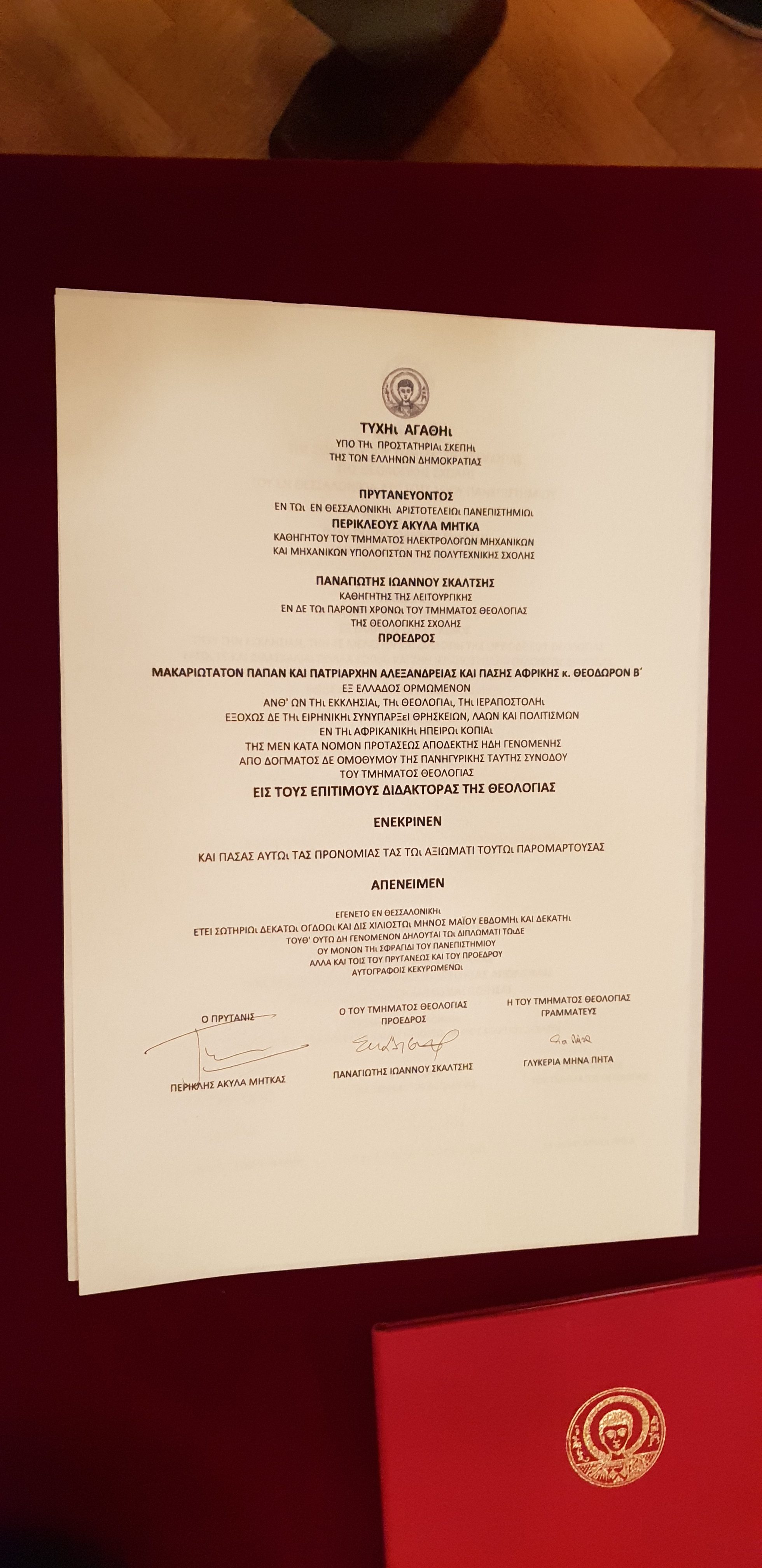 Σε επίτιμο διδάκτορα του τμήματος Θεολογίας της Θεολογικής Σχολής του ΑΠΘ, από την οποία αποφοίτησε, αναγορεύτηκε ο Πατριάρχης Αλεξανδρείας και πάσης Αφρικής, Θεόδωρος, σε εκδήλωση που έγινε στην αίθουσα τελετών της Παλαιάς Φιλοσοφικής Σχολής του ΑΠΘ.