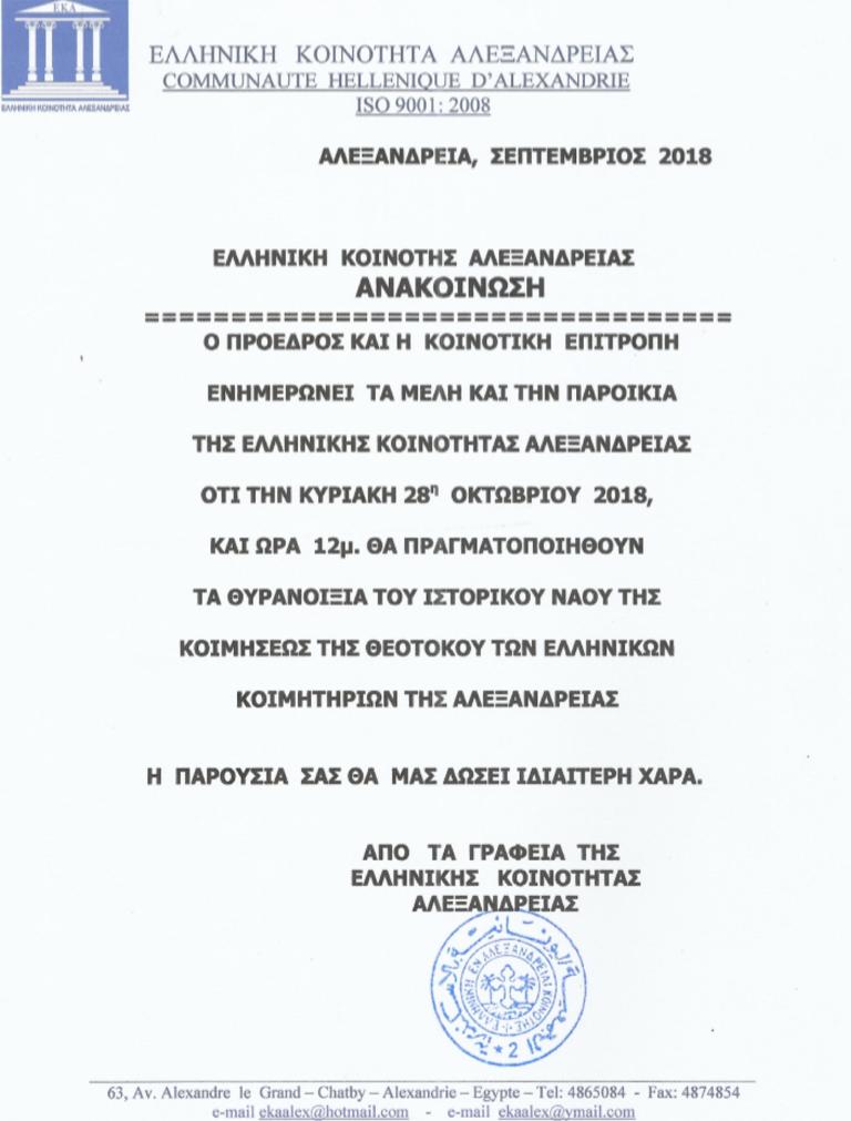 Επίσημη ανακοίνωση, όπου προσκαλεί όλη την παροικία, εξέδωσε η Ελληνική Κοινότητα Αλεξανδρείας, για την 28η Οκτωβρίου, την ημέρα όπου θα τελεστούν τα θυρανοίξια του περικαλλούς και ιστορικού ναού της Κοιμήσεως της Θεοτόκου των Κοιμητηρίων της ΕΚΑ, δίπλα από το Ελληνικό Τετράγωνο του Σάτμπι.