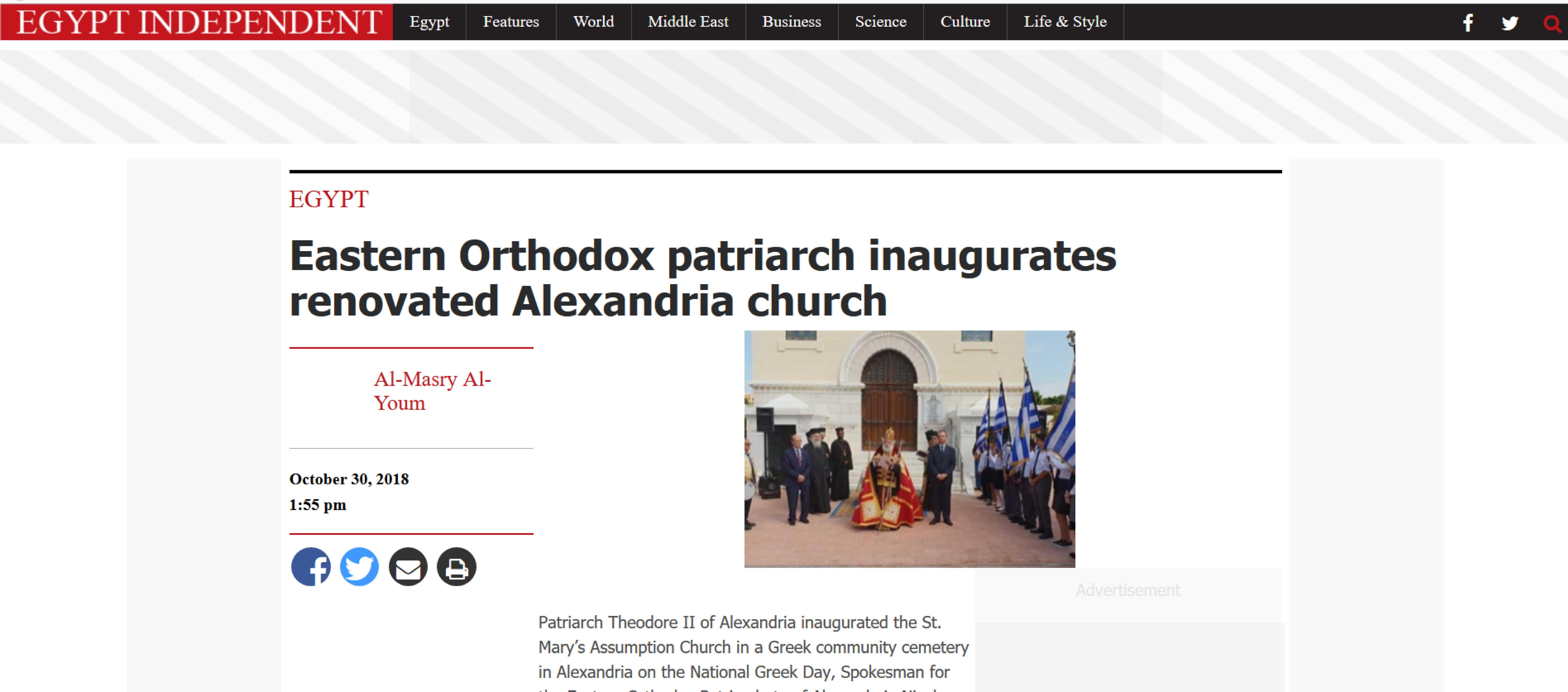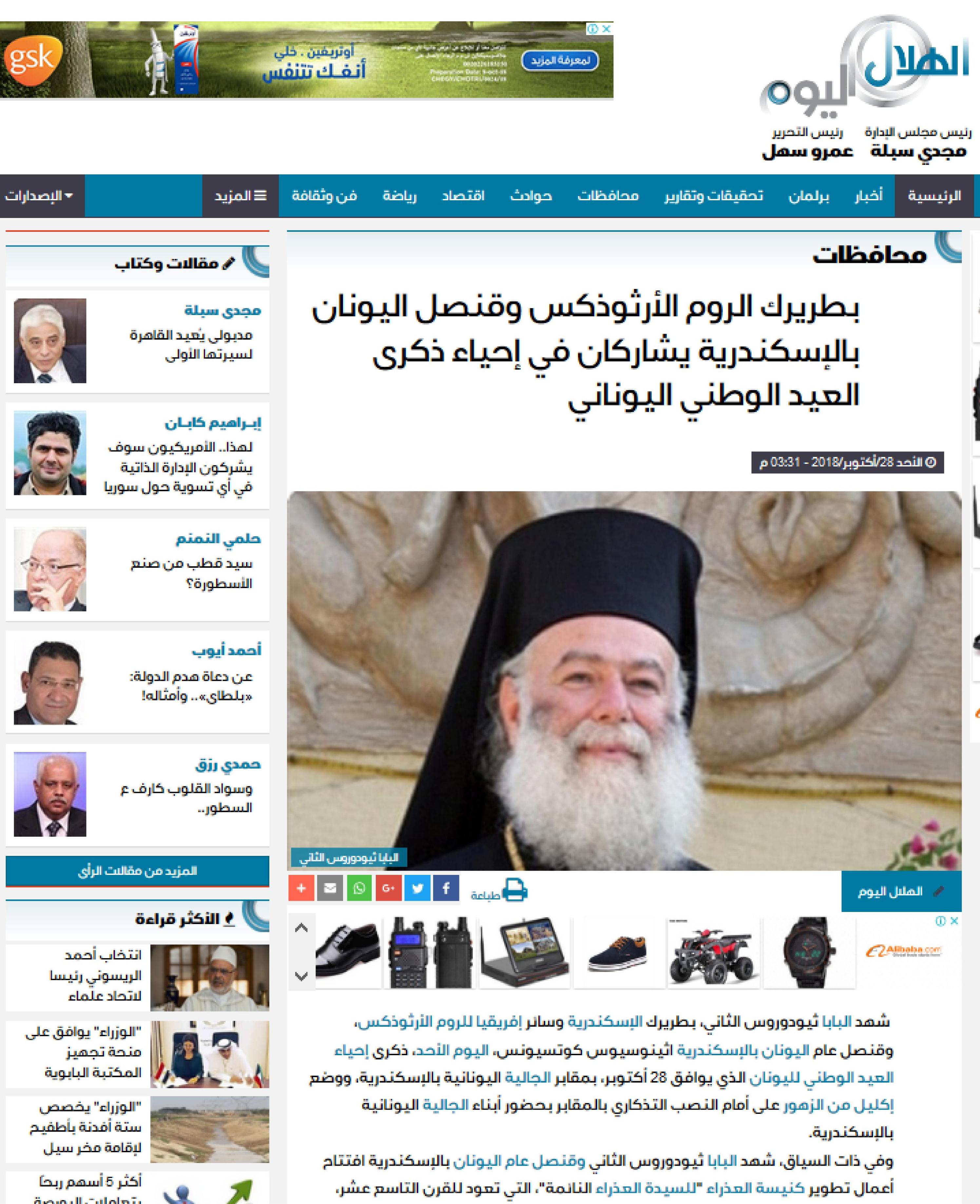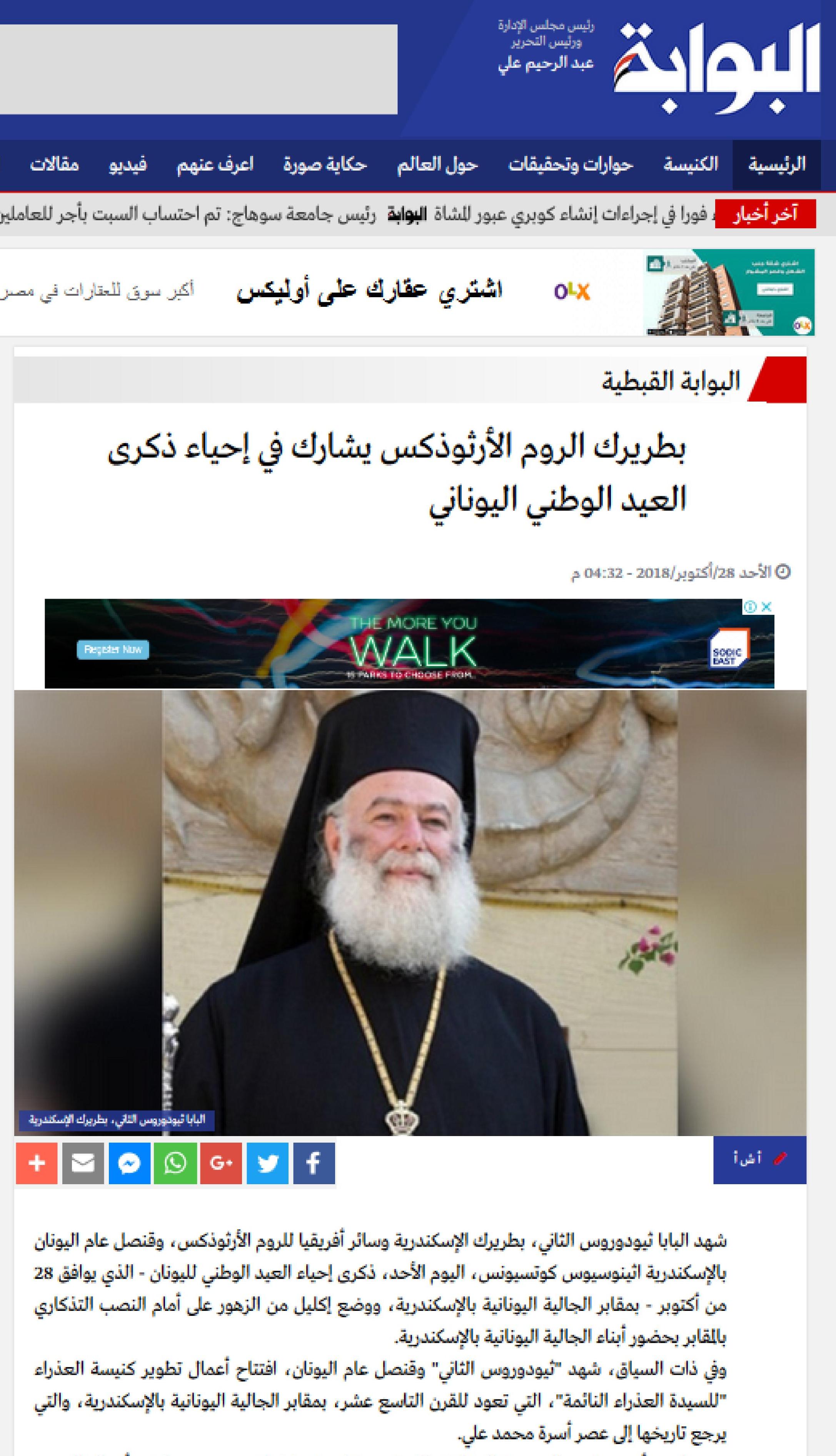 Ιδιαίτερα σημαντικά είναι τα δημοσιεύματα που παρουσιάστηκαν από τα αιγυπτιακά Μέσα Μαζικής Ενημέρωσης για τα ιστορικά Θυρανοίξια της περικαλλούς εκκλησίας της Κοίμησης της Θεοτόκου των Κοιμητηρίων της Ελληνικής Κοινότητας Αλεξανδρείας, που πραγματοποιήθηκαν από τον Πατριάρχη Αλεξανδρείας και πάσης Αφρικής κ.κ. Θεόδωρο Β΄, στις 28 Οκτωβρίου 2018, παρουσία του Γενικού Προξένου της Ελλάδας στην Αλεξάνδρεια κ. Αθανάσιου Κοτσιώνη, του Προέδρου της Ελληνικής Κοινότητας Αλεξανδρείας κ. Εδμόνδου Κασιμάτη, πολλών άλλων επισήμων και πολύ κόσμου.