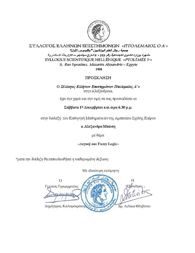 Μία ακόμη ενδιαφέρουσα ομιλία αναμένεται να μας παρουσιάσει ο Αλεξανδρινός μαθηματικός κ. Αλέξανδρος Μπάσης, το Σάββατο 1 Δεκεμβρίου και ώρα 6 και μισή το απόγευμα, στον Σύλλογο Ελλήνων Επιστημόνων Αλεξανδρείας «Πτολεμαίος Α΄».
