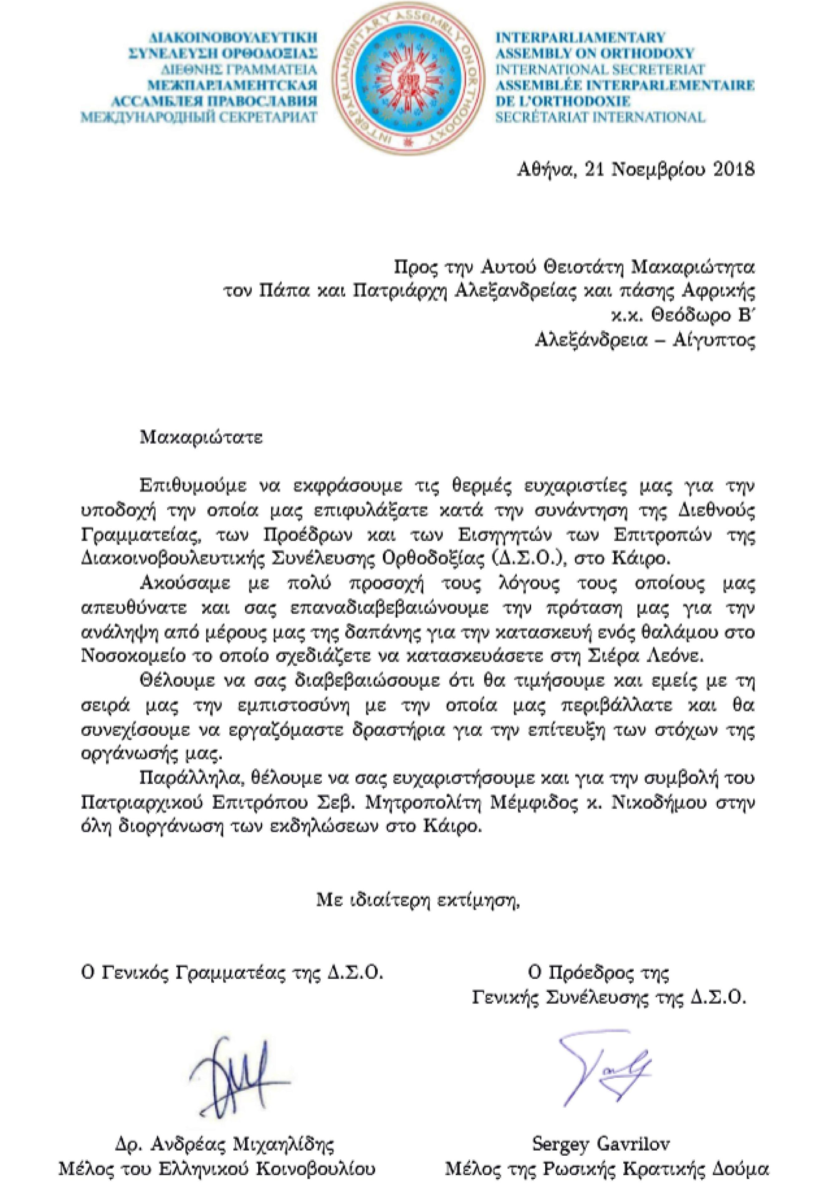 Ο Πρόεδρος της Συνέλευσης, Ρώσος βουλευτής Σεργκέι Γαβρήλωφ και ο Γενικός Γραμματέας, Έλληνας βουλευτής Ανδρέας Μιχαηλίδης, τονίζουν στην επιστολή που στείλανε προς τον Αλεξανδρινό Προκαθήμενο ότι «ακούσαμε με πολύ προσοχή τους λόγους τους οποίους μάς απευθύνατε, και σάς επαναδιαβεβαιώνουμε την πρότασή μας για την ανάληψη από μέρους μας, της δαπάνης για την κατασκευή ενός θαλάμου στο Νοσοκομείο το οποίο σχεδιάζετε να κατασκευάσετε στη Σιέρα Λεόνε».