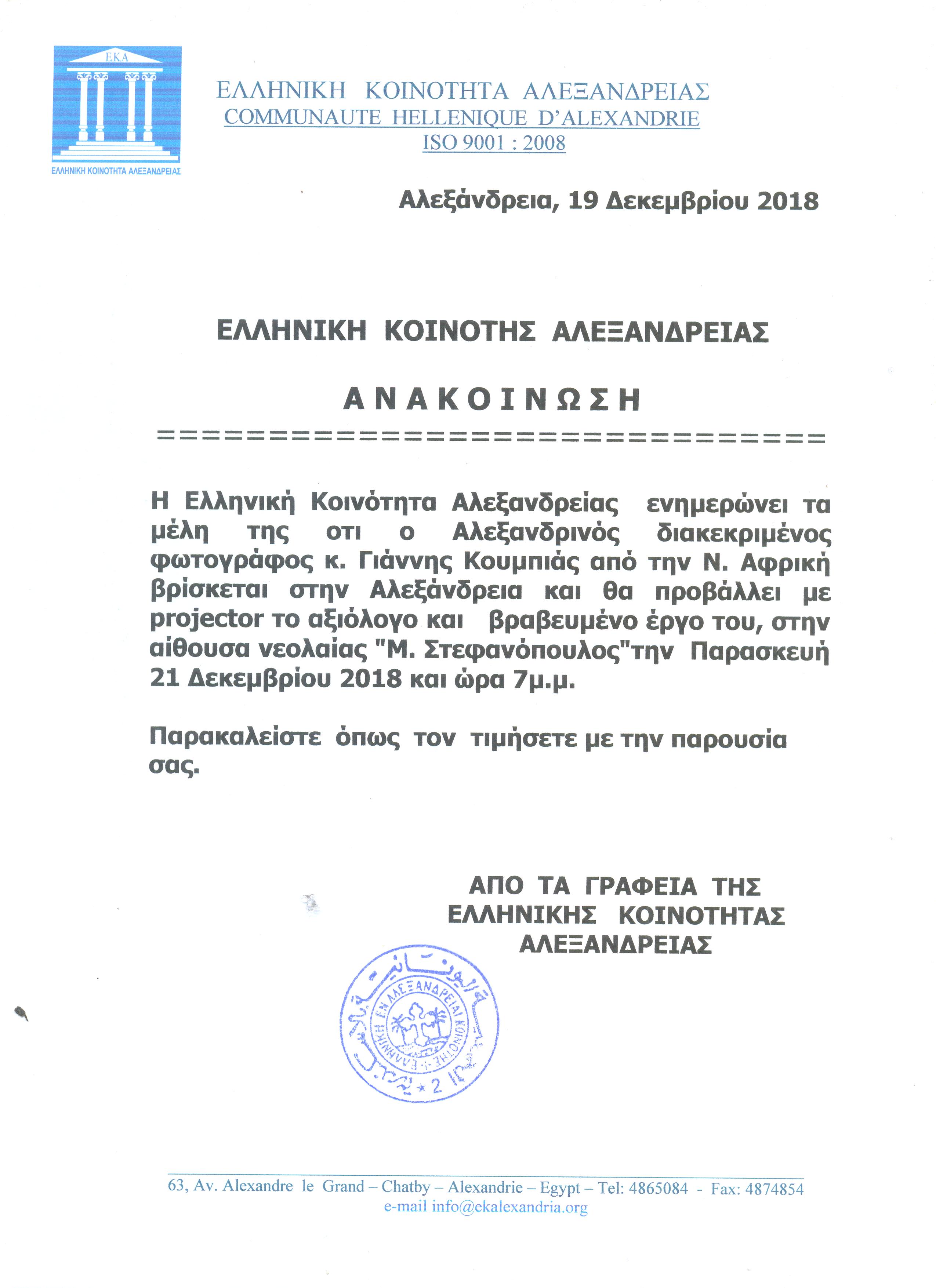 Η Ελληνική Κοινότητα Αλεξανδρείας ενημερώνει τα μέλη της, ότι ο Αλεξανδρινός διακεκριμένος φωτογράφος κ. Γιάννης Κουμπιάς από την Ν. Αφρική, βρίσκεται στην Αλεξάνδρεια και θα προβάλλει με projector το αξιόλογο και βραβευμένο έργο του, στην αίθουσα νεολαίας «Μ. Στεφανόπουλος», την Παρασκευή 21 Δεκεμβρίου 2018 και ώρα 7 μ.μ.