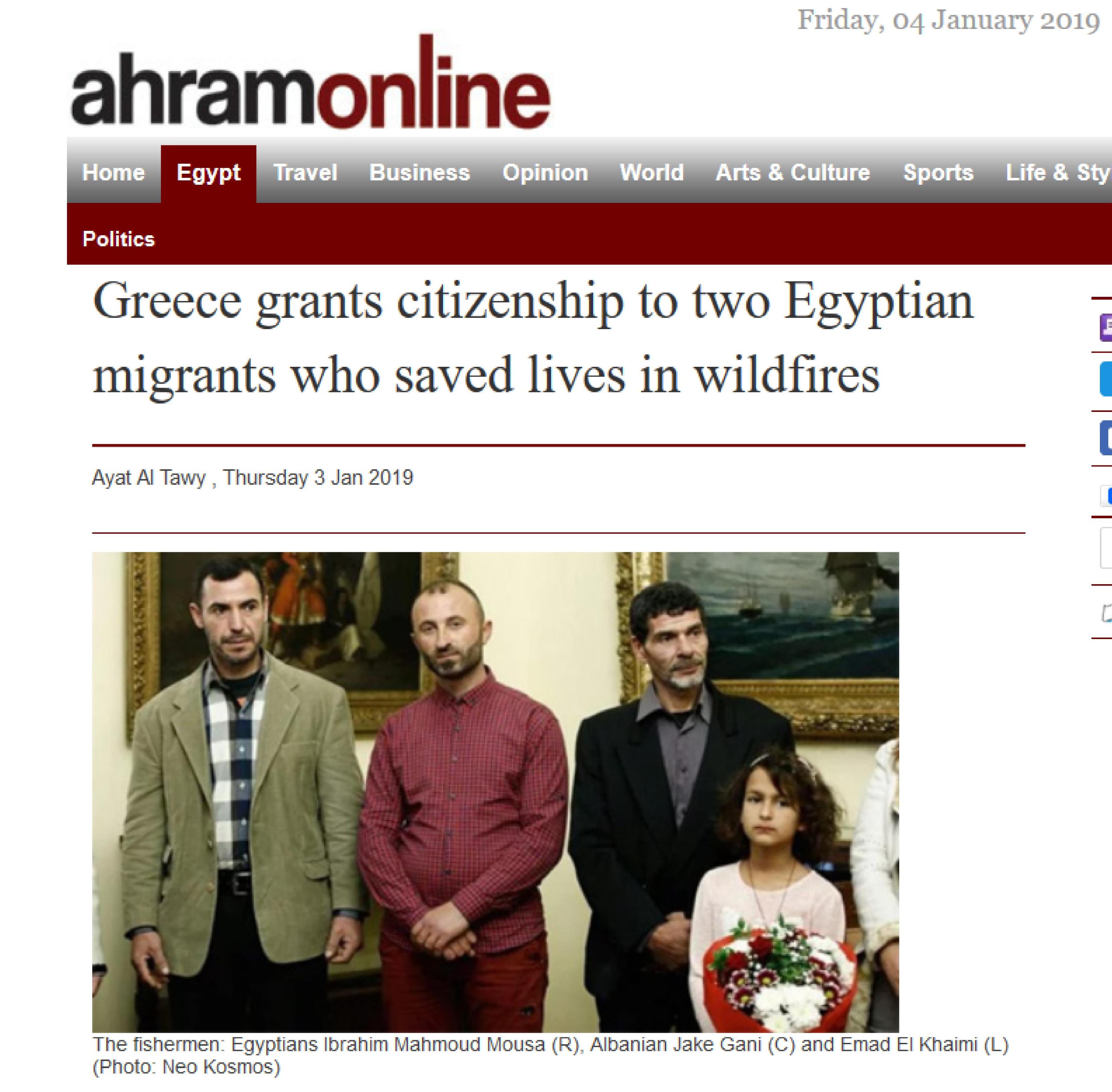 Αναλυτικό ρεπορτάζ φιλοξενεί η μεγάλης κυκλοφορίας αιγυπτιακή εφημερίδα «Αλ Αχράμ», σχετικά με την παραχώρηση της ελληνικής υπηκοότητας στους τρεις ψαράδες, δύο Αιγύπτιους και έναν Αλβανό, που έσωσαν ζωές κατά τις φονικές πυρκαγιές στο Μάτι της Αττικής, στις 23 του περασμένου Ιουλίου.