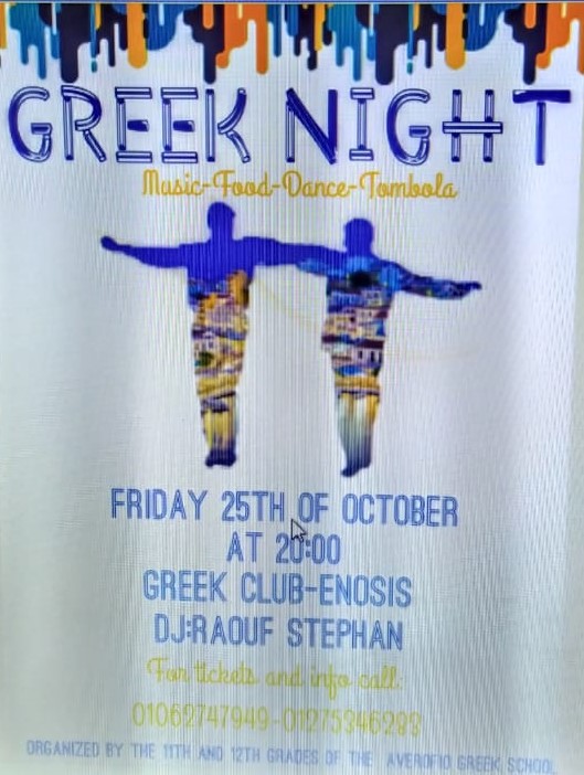 Την Παρασκευή, λοιπόν, στις 25 Οκτωβρίου, στις 8 το βράδυ, στην Ένωση, για να γευτείτε ελληνικούς όμορφους μεζέδες, να ακούσετε ελληνική μουσική, να χορέψετε και πάνω από όλα να στηρίξετε τους αιγυπτιώτες αλεξανδρινούς μαθητές του Αβερωφείου.
