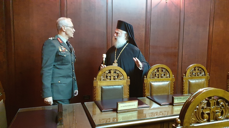 Επιφυλάσσοντας θερμή υποδοχή, στη Μεγάλη Αίθουσα του Θρόνου, ο Πατριάρχης Θεόδωρος υποδέχτηκε τον Αρχηγό ΓΕΣ ψάλλοντας το «Τη Υπερμάχω» και με το άκουσμα των δύο εθνικών ύμνων, της Ελλάδας και της Αιγύπτου.