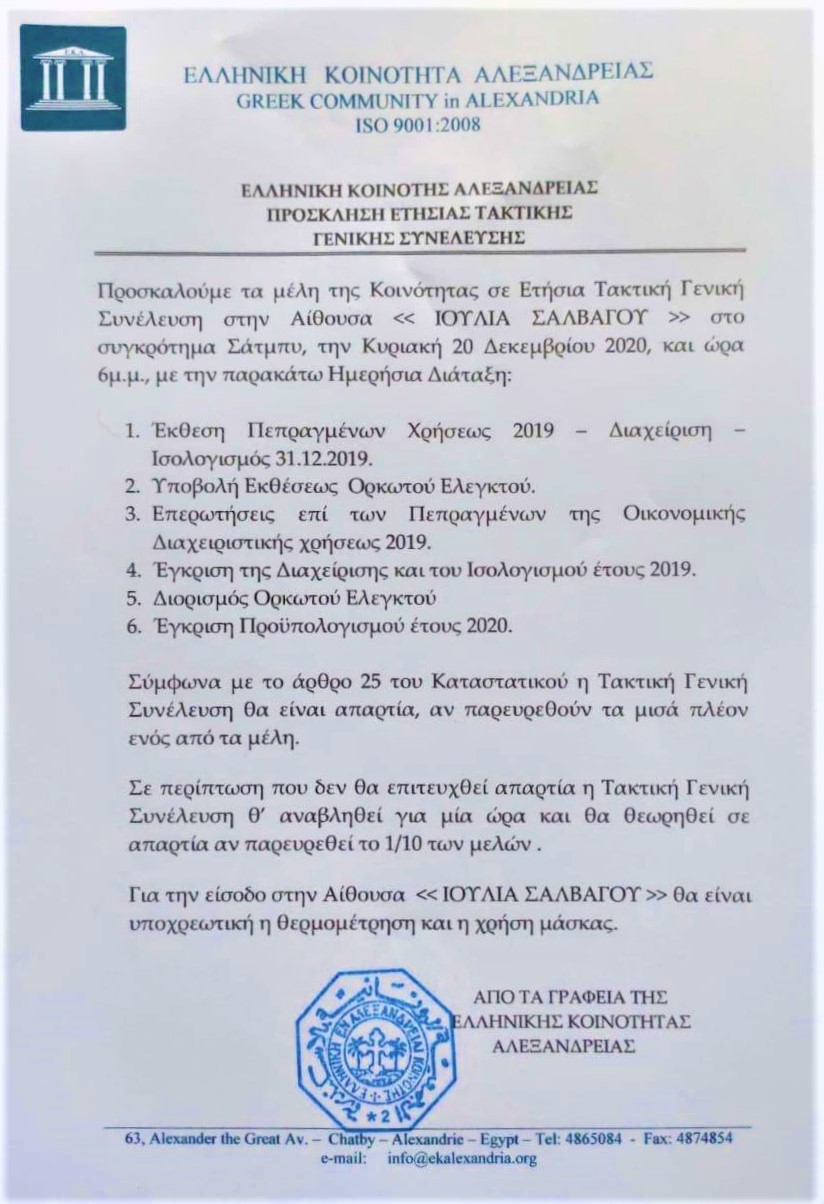 Την ετήσια τακτική Γενική της Συνέλευση πραγματοποιεί η Ελληνική Κοινότητα Αλεξανδρείας, την Κυριακή 20 Δεκεμβρίου και ώρα 6 το απόγευμα, στην Αίθουσα «ΙΟΥΛΙΑΣ ΣΑΛΒΑΓΟΥ» στο συγκρότημα Σάτμπυ, όπως ανακοινώθηκε από τον πρεσβυγενή παροικιακό οργανισμό.