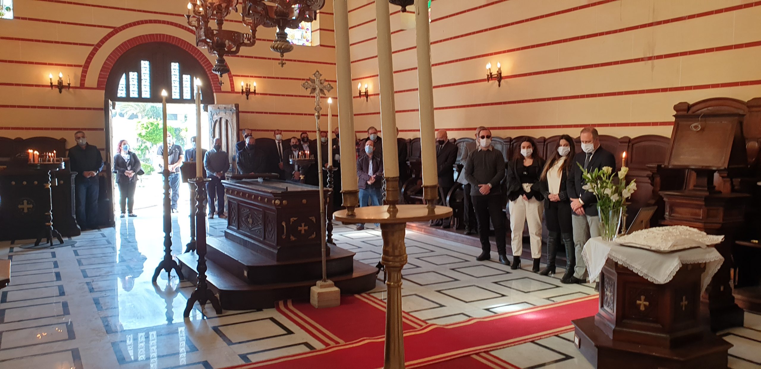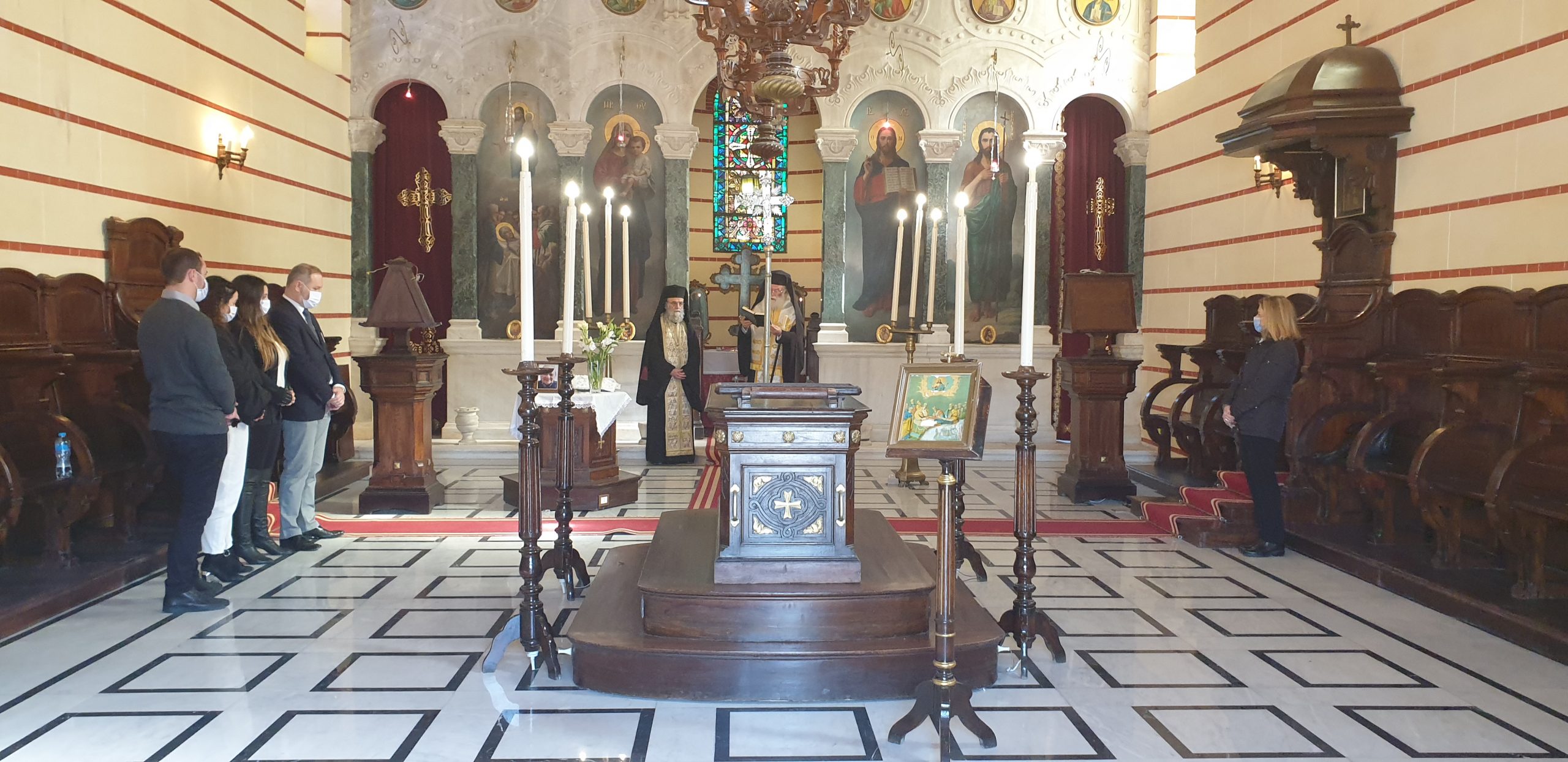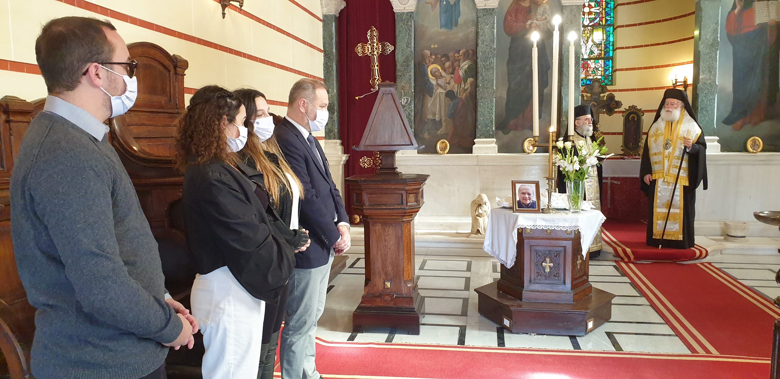 Στο πλευρό του κ. Ι. Σιόκα, η σύζυγός του Ελένη και τα τρία παιδιά του, τα εγγόνια του Γεωργίου Σιόκα, να κοιτάνε την φωτογραφία του παππού τους, στο μνημόσυνο που τελούσε ο Πατριάρχης Θεόδωρος, παρουσία πολλών παροίκων και μεταξύ αυτών, μελών της Κοινοτικής Επιτροπής. Ήταν εκεί να συμπαρασταθούν στην οικογένεια και τον Πρόεδρο της ΕΚΑ, ο Α΄ Αντιπρόεδρος της Κοινότητας κ. Ανδρέας Βαφειάδης, η Β΄ Αντιπρόεδρος κα Μαίρη Παυλίδου και ο Οικονομικός Επόπτης κ. Πάρης Πεφάνης Μακρής, καθώς επίσης και η Πρόεδρος του Ελληνικού Ναυτικού Ομίλου Αλεξανδρείας και του «Πτολεμαίου» κα Λιλίκα Θλιβίτου, ο Πρόεδρος του Ελληνικού Εμπορικού Επιμελητηρίου Αλεξανδρείας κ. Βύρων Βαφειάδης, ο Έφορος Προσκόπων κ. Άρης Μαρκοζάνης, ο πρώην Αντιπρόεδρος της ΕΚΑ κ. Δημήτρης Βαφειάδης και άλλοι επίσημοι.