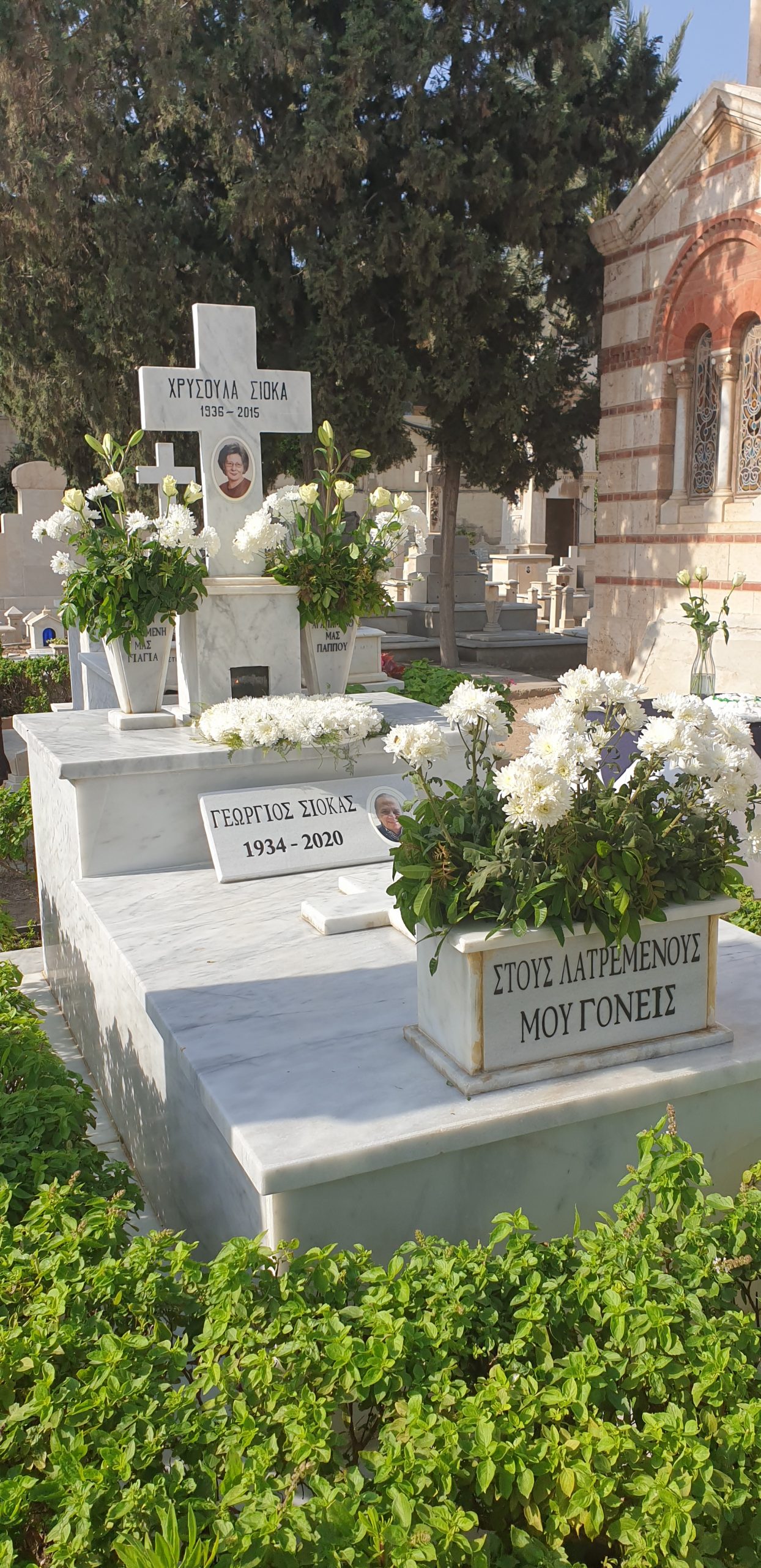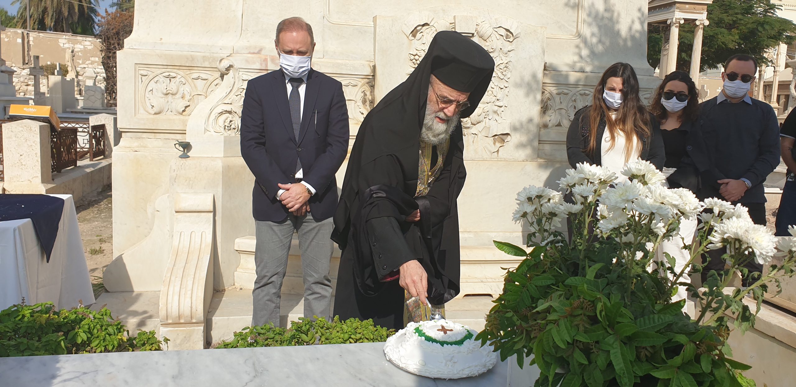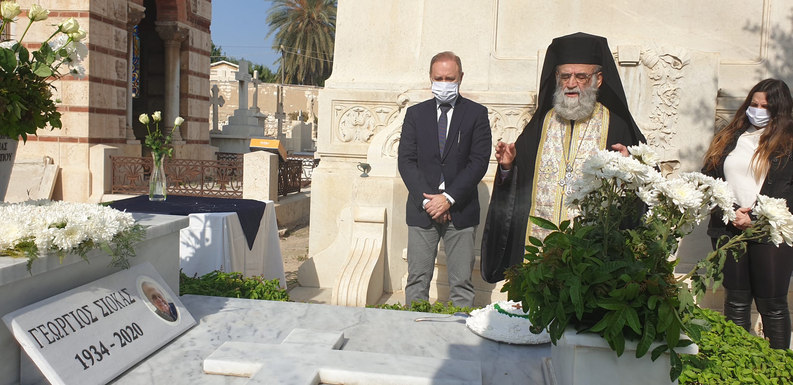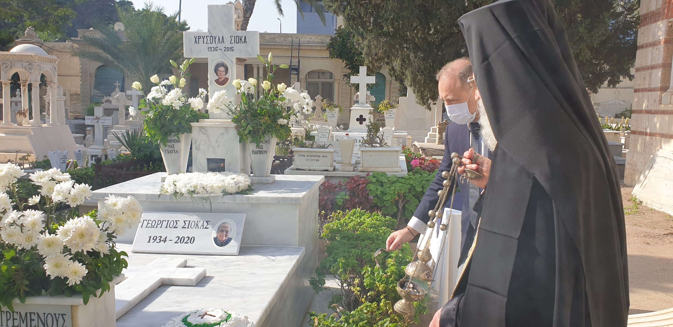 Ακολούθησε το τρισάγιο που ετέλεσε ο Γέρων Σκευοφύλακας του Πατριαρχείου Αλεξανδρείας π. Παύλος Ιωσηφίδης, στον τάφο των γονέων του Ιωάννη Σιόκα, του πατέρα του Γεωργίου και της μητέρας του Χρυσούλας, που βρίσκονται αναπαυμένοι στο χώρο όπου έχει δεχτεί στα σπλάχνα του, τους Αλεξανδρινούς, που όλοι, άλλος λιγότερο, άλλος περισσότερο έχουν προσφέρει στην πρεσβυγενή ελληνική παροικία της πόλης του Μεγάλου Αλεξάνδρου.