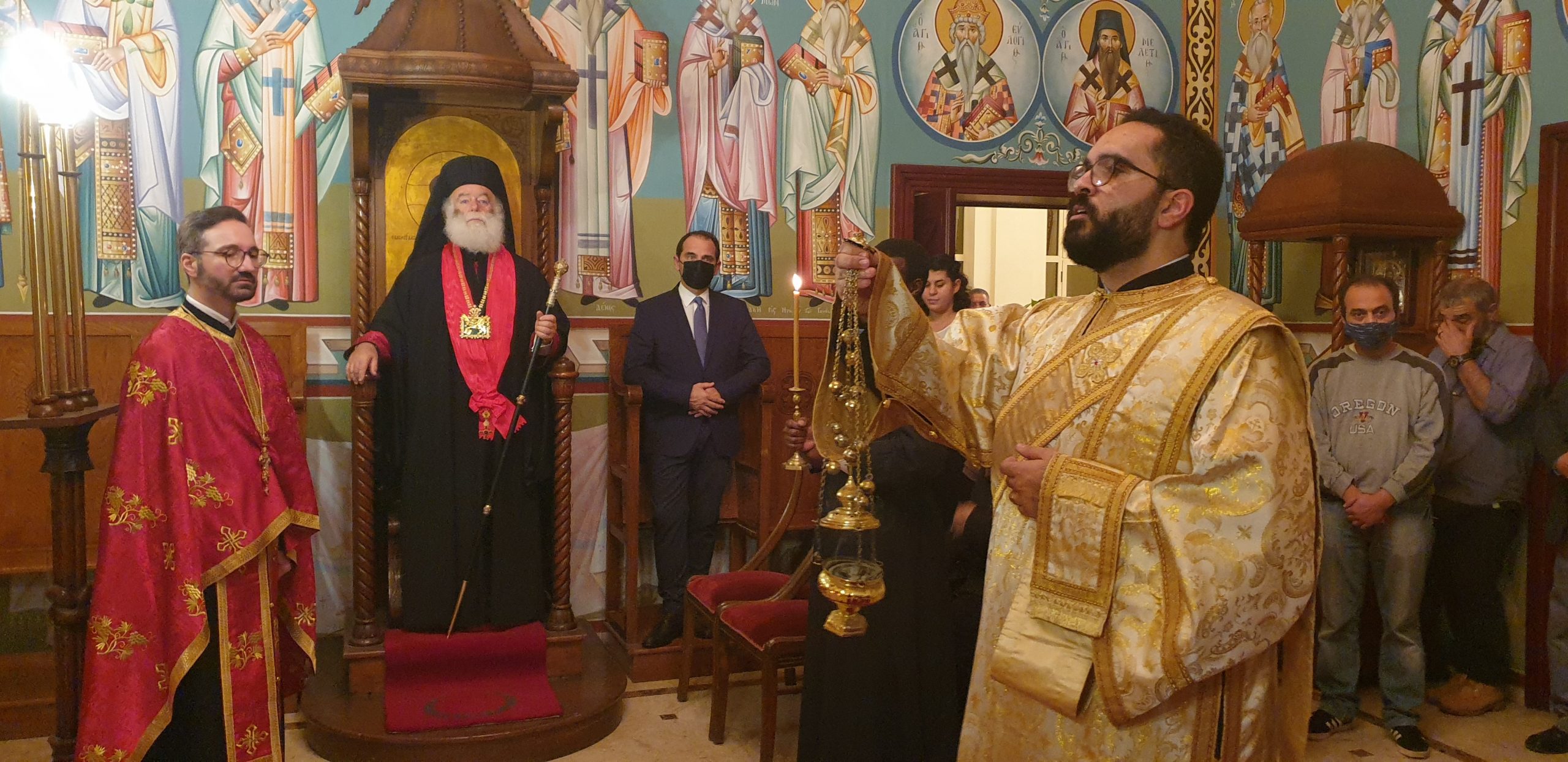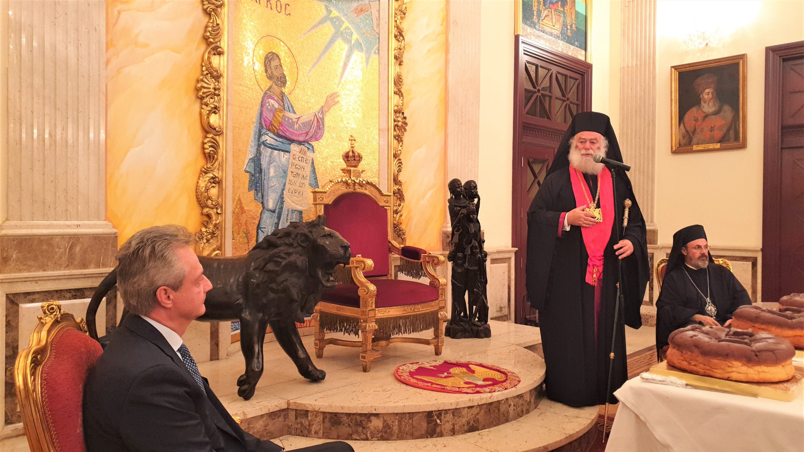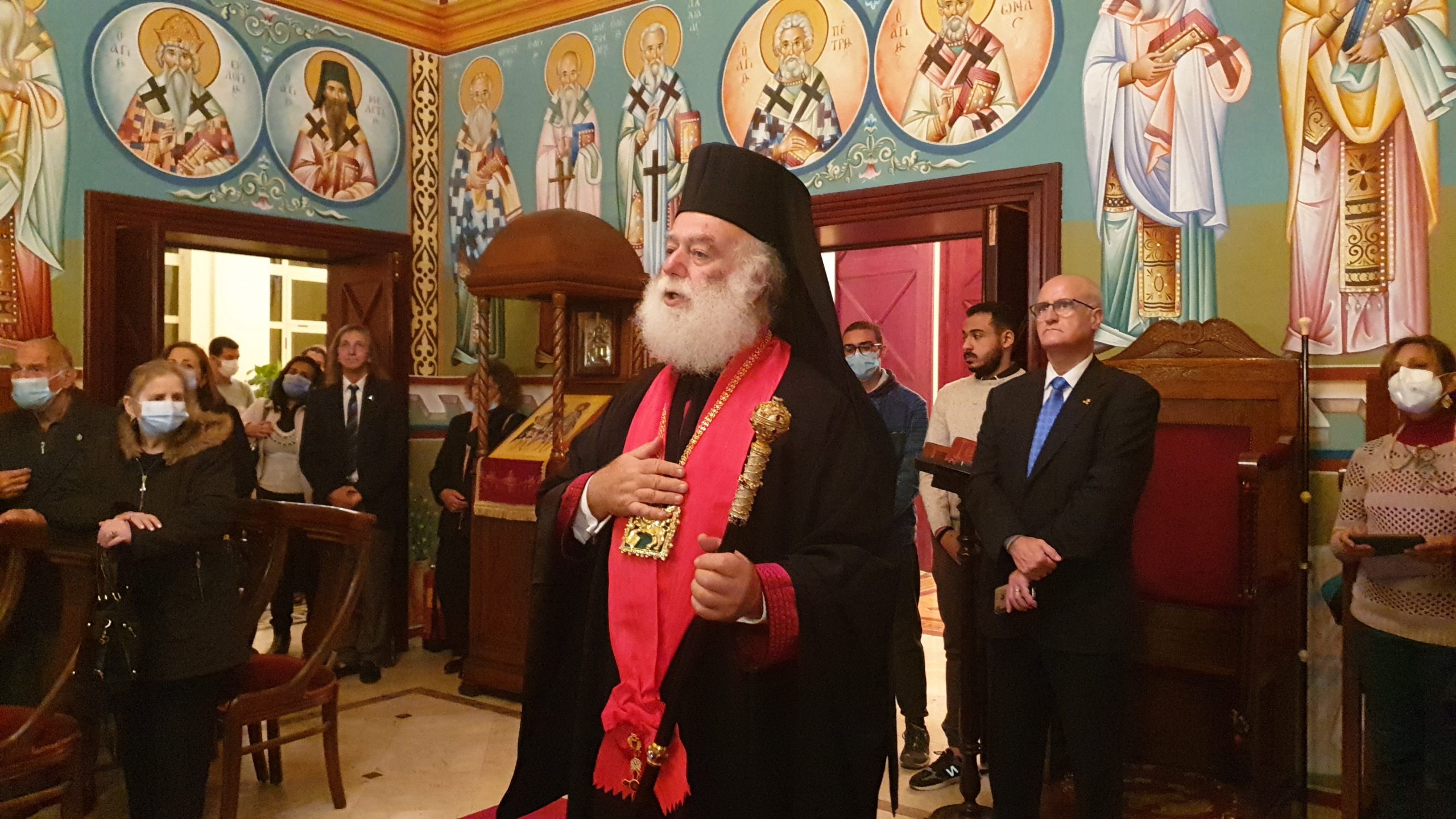 Εξίσου ιδιαίτερη η στιγμή, όταν ο Πατριάρχης Θεόδωρος αναφέρθηκε στον Αντιπρόεδρο της Ελληνικής Κοινότητας Αλεξανδρείας κ. Ανδρέα Βαφειάδη, στο πρόσωπο του οποίου χαιρέτησε όλη την ελληνική πρεσβυγενή παροικία της πόλεως του Μεγάλου Αλεξάνδρου για τη στήριξή της στο Θρόνο του Αποστόλου Μάρκου.
