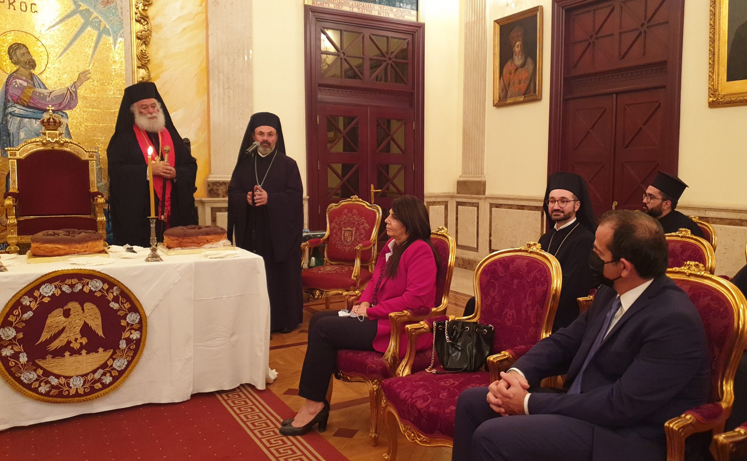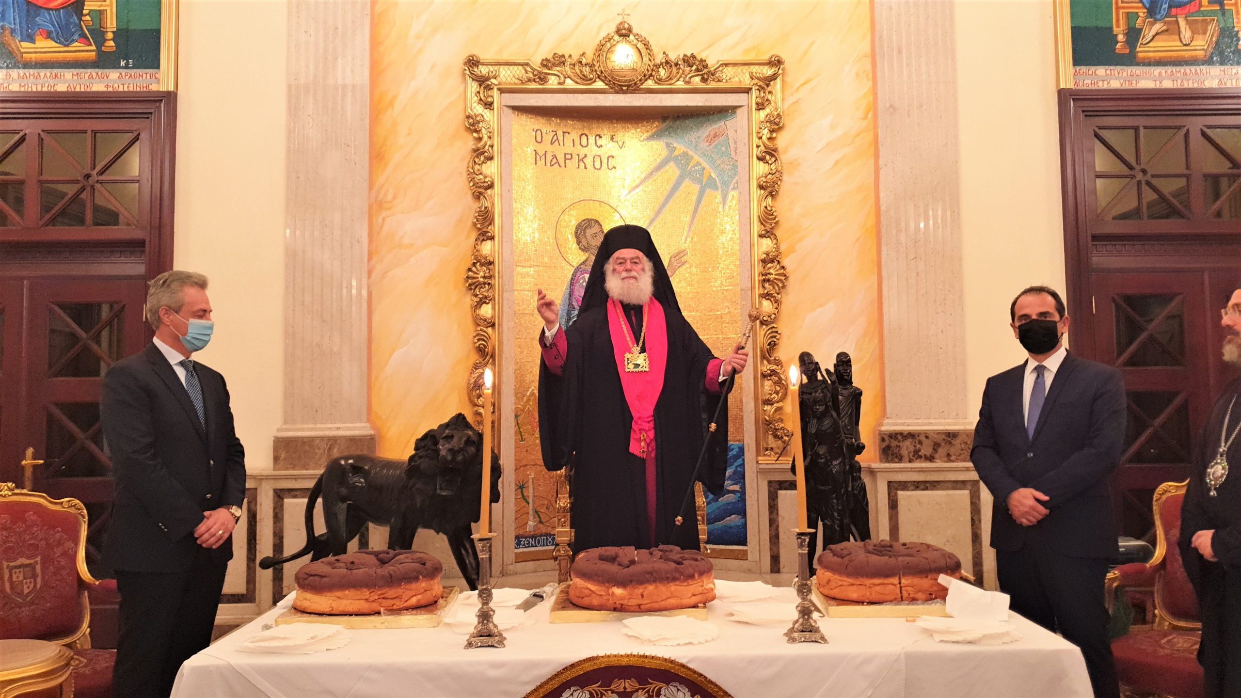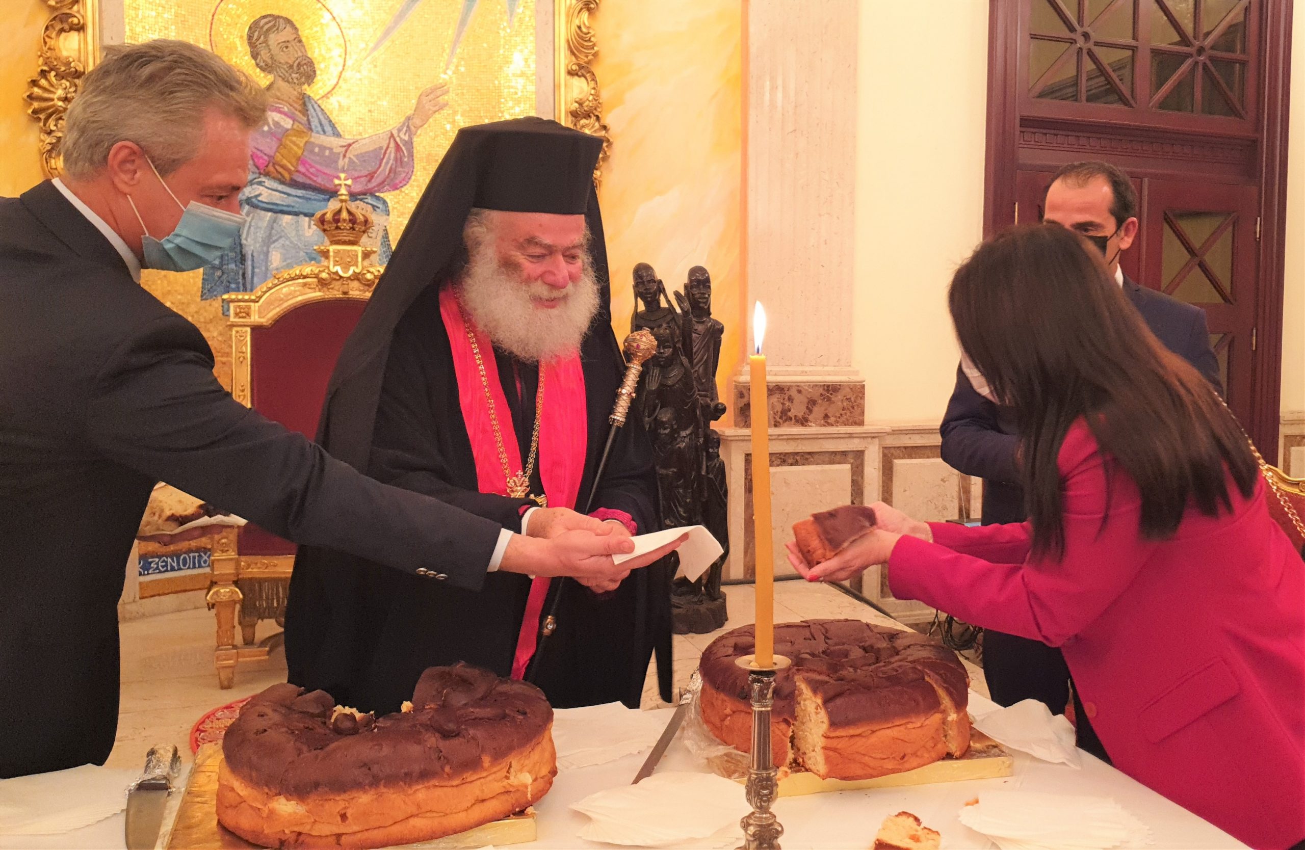 Τέλος, ο Πατριάρχης Θεόδωρος, όπως κάθε χρόνο, έψαλλε τα παραδοσιακά πρωτοχρονιάτικα κάλαντα «Αρχιμηνιά κι Αρχιχρονιά…», μετά το κόψιμο της πρώτης αγιοβασιλιάτικης πίτας, παρουσία πολύ κόσμου από την ελληνική παροικία και το ελληνορθόδοξο αραβόφωνο ποίμνιο της Αλεξάνδρειας.