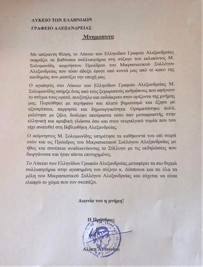 «Με απέραντη θλίψη, το Λύκειο των Ελληνίδων Γραφείο Αλεξανδρείας εκφράζει τα βαθύτατα συλλυπητήρια στη σύζυγο του εκλιπόντος Μιχάλη Σολομωνίδη, αειμνήστου Προέδρου του Μικρασιατικού Συλλόγου Αλεξανδρείας που τόσο άδοξα έφυγε από κοντά μας από το κακό της πανδημίας που μαστίζει την εποχή μας.