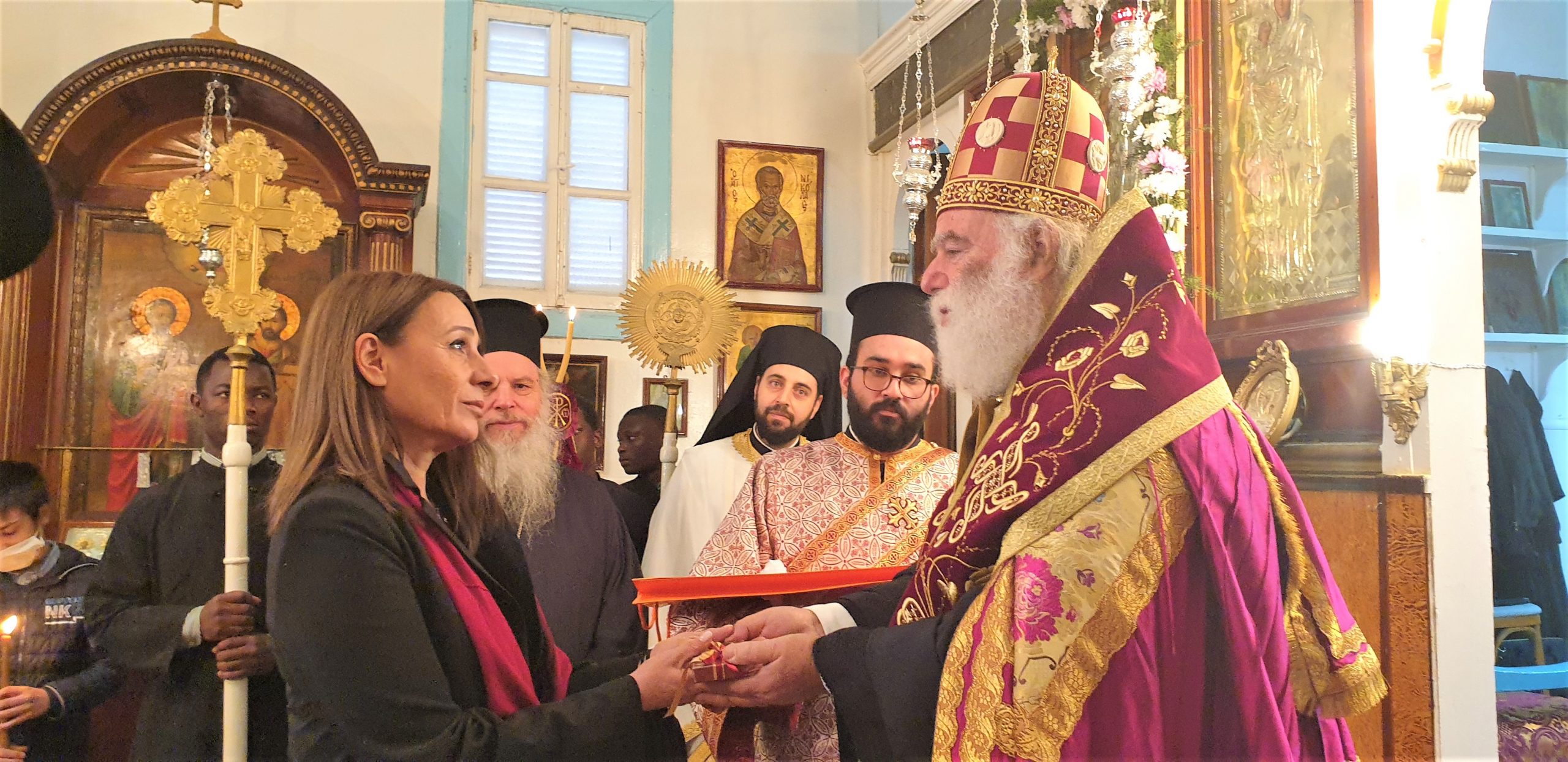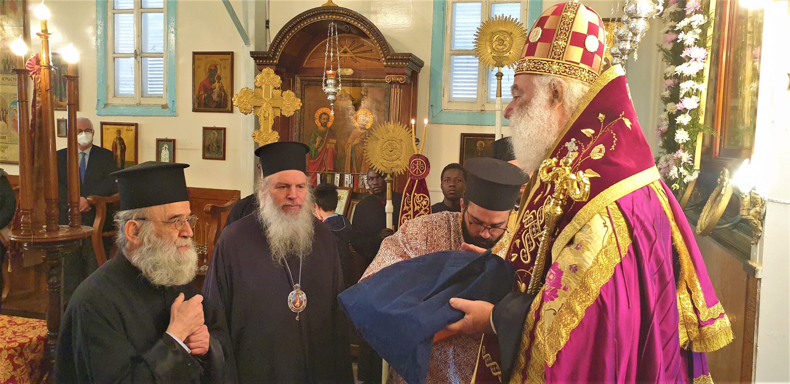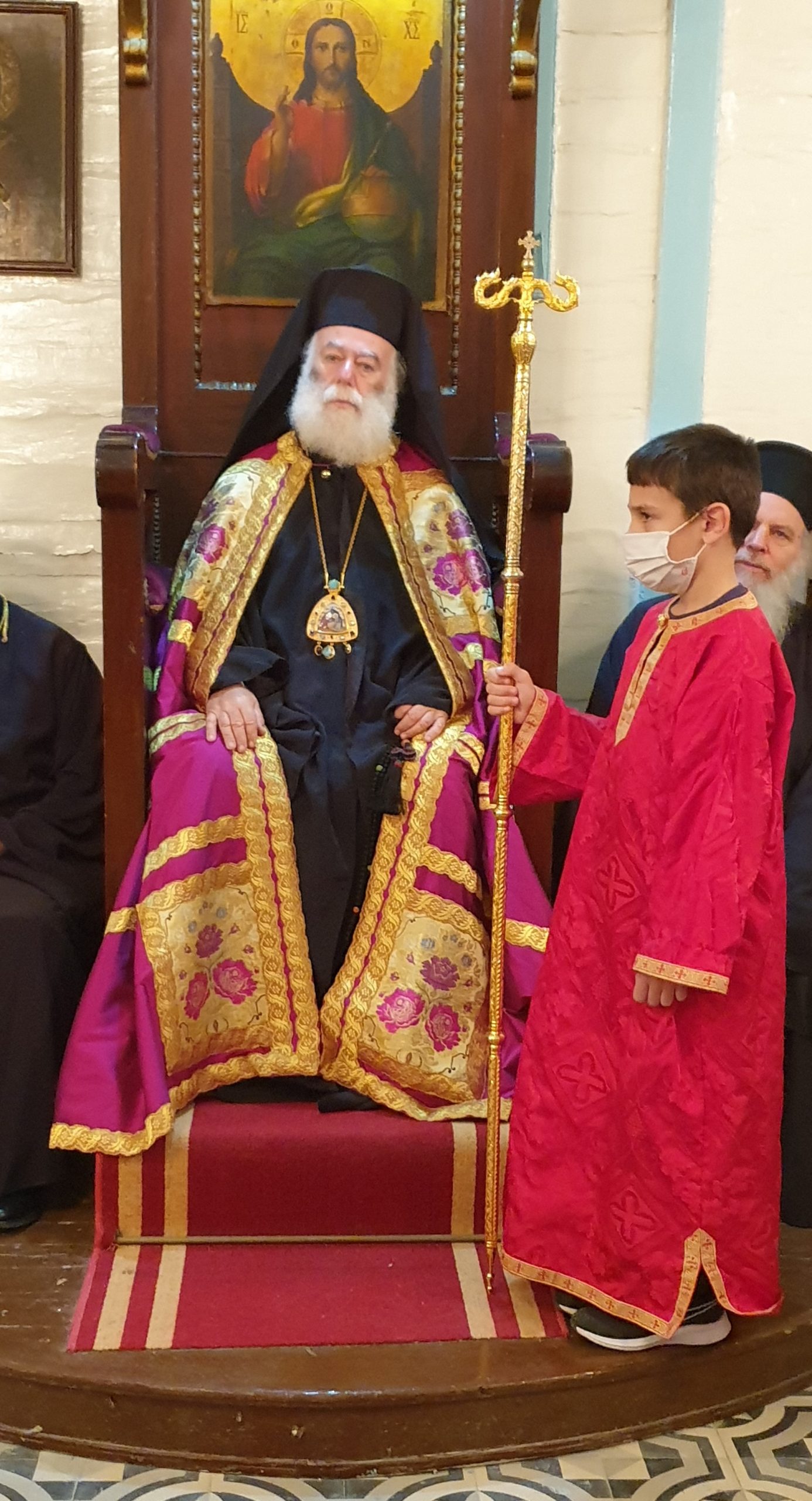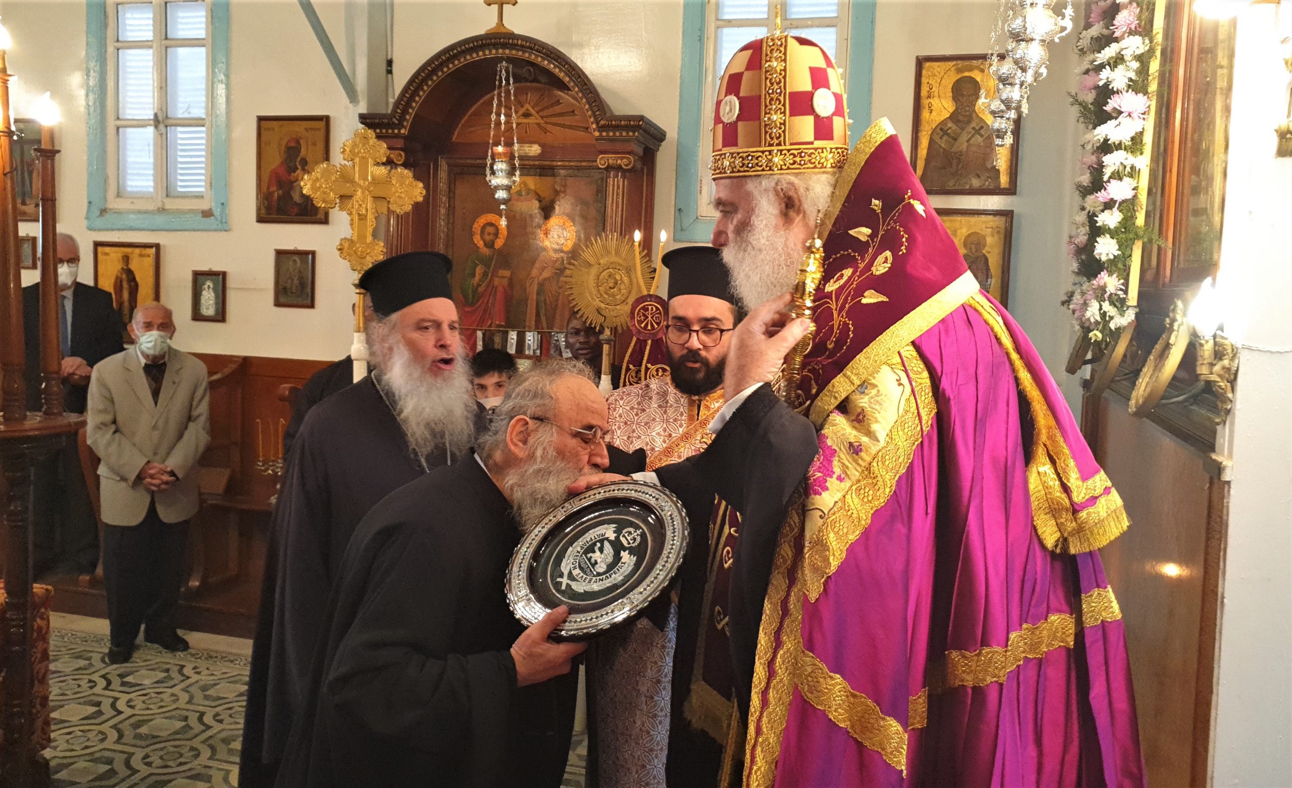 Εξάλλου, παρουσία του Πατριαρχικού Επιτρόπου Αλεξανδρείας Μητροπολίτου Ναυκράτιδος κ. Νάρκισσου και του Επισκόπου Ταμιάθεως κ. Γερμανού, εκφράζοντας την προσωπική του ευγνωμοσύνης στους δύο θαυματουργούς Αγίους, ο Πατριάρχης Θεόδωρος προσέφερε το πετραχήλι του στο ναό.