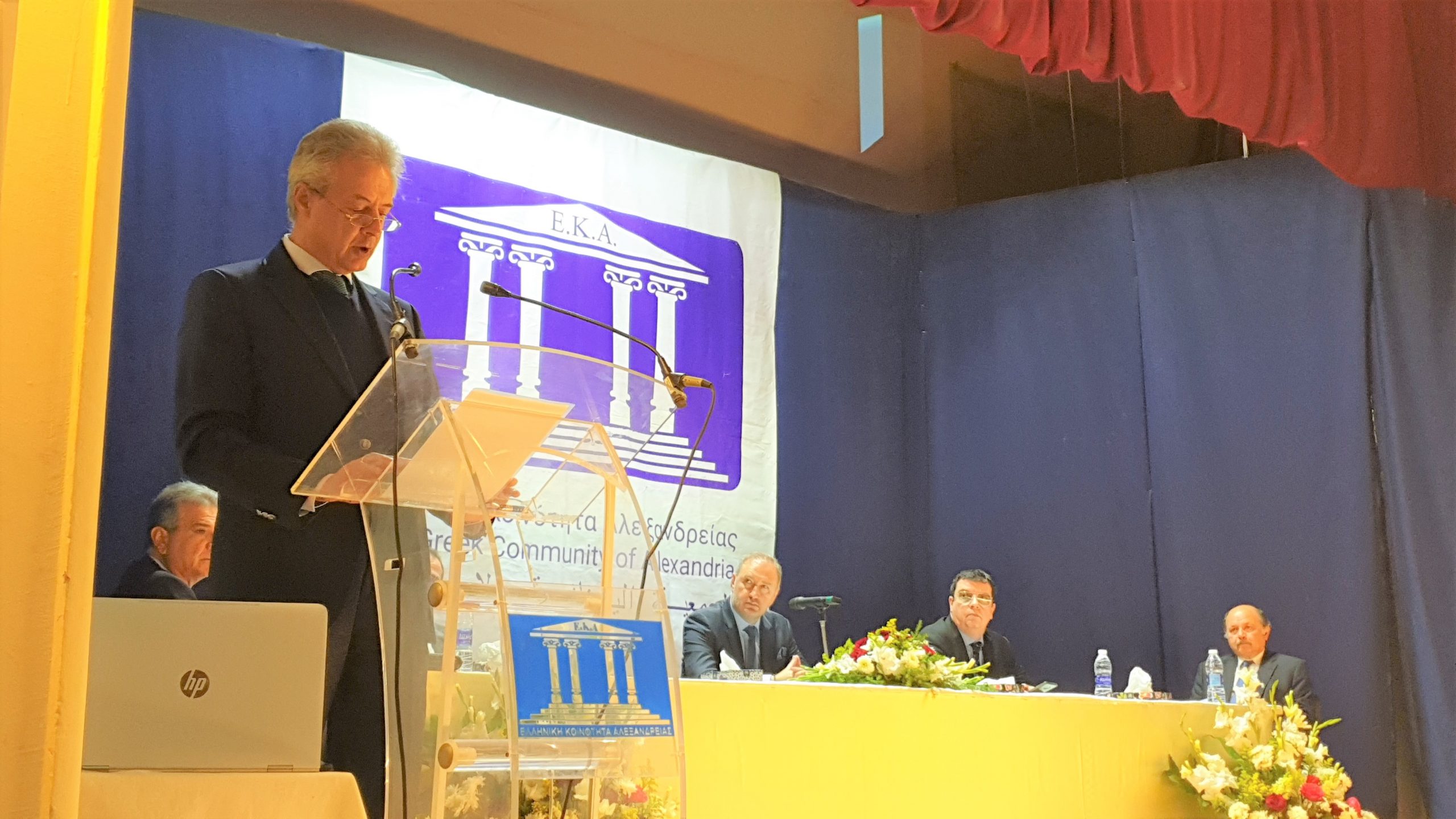«Η Ελληνική Κοινότητα της Αλεξάνδρειας, μέσα από τη δημιουργική πορεία της στον χρόνο, εκπροσωπεί την ιδιαίτερη εκείνη ποιότητα του Ελληνισμού της διασποράς, ποιότητα χαρακτηριστική της ψυχής του Ελληνισμού. Είναι η ικανότητα εκείνη, που οδηγεί εμάς τους Έλληνες, ανεξαρτήτως συνθηκών, να προσπαθούμε, να εργαζόμαστε, να δημιουργούμε, να καινοτομούμε, να πρωταγωνιστούμε, να πέφτουμε και να ξανασηκωνόμαστε, ξανά και ξανά, να βρίσκουμε λύσεις και διέξοδο ακόμη και όταν όλες οι συνθήκες φαίνεται να συνωμοτούν εναντίον μας. Χαρακτηριστικός, εν προκειμένω, ο χρησμός του Μαντείου των Δελφών για την Ελλάδα και τους Έλληνες: «Ασκός κλυδωνιζόμενος, μηδέποτε βυθιζόμενος», τόνισε χαρακτηριστικά ο Γενικός Πρόξενος.