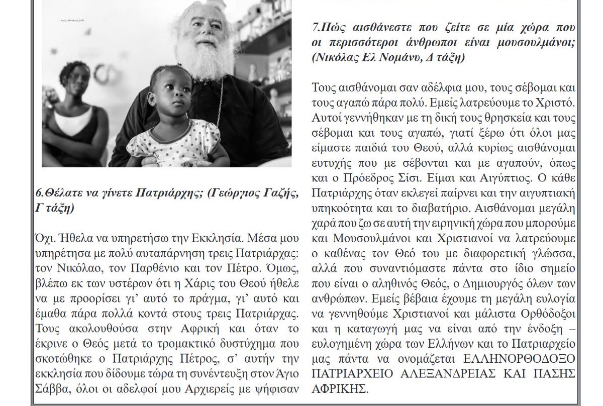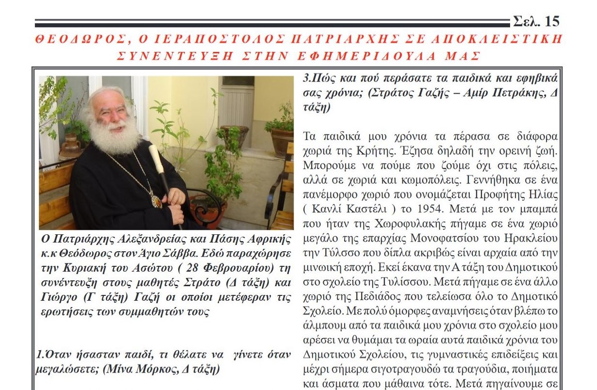 Παραθέτουμε όλο το κείμενο της συνέντευξης του Πατριάρχη Αλεξανδρείας στην «Εφημεριδούλα» του Τοσίτσαιου – Πρατσίκειου Σχολείου της ΕΚΑ: