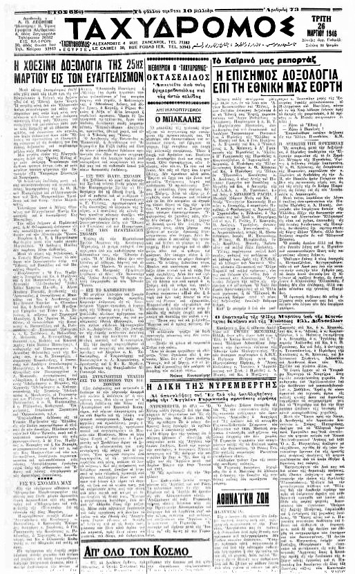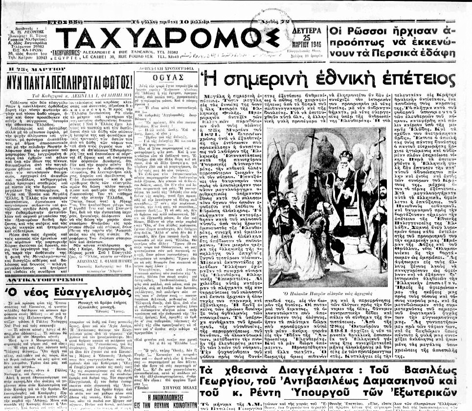 Λίγοι μήνες είχαν περάσει από τη λήξη του Β΄ Παγκοσμίου Πολέμου και ο Αλεξανδρινός Ελληνισμός ζούσε σε ένα ανάμεικτο κλίμα κατάνυξης αλλά και μεγαλοπρέπειας την πρώτη μεταπολεμική επέτειο του 1821, στις 25 Μαρτίου του 1946, παρουσία μάλιστα της Πριγκίπισσας Φρειδερίκης.