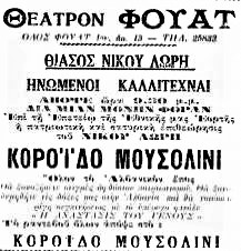 Στον Θέατρον Φουάτ, ο Θίασος του Νίκου Λωρή και οι Ηνωμένοι Καλλιτέχναι, διά μίαν μόνην φοράν, παρουσίαζαν επί τη επαιτείω της Εθνικής μας Εορτής, η πατριωτική και σατυρική επιθεώρησις «ΚΟΡΟΪΔΟ ΜΟΥΣΟΛΙΝΙ».