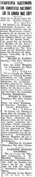 Μετά το πέρας της δοξολογίας, ο κ. Γενικός Πρόξενος έδωσε το σύνθημα των ζητωκραυγών υπέρ του Έθνους, του Βασιλέως και του Βασιλέως Φαρούκ».