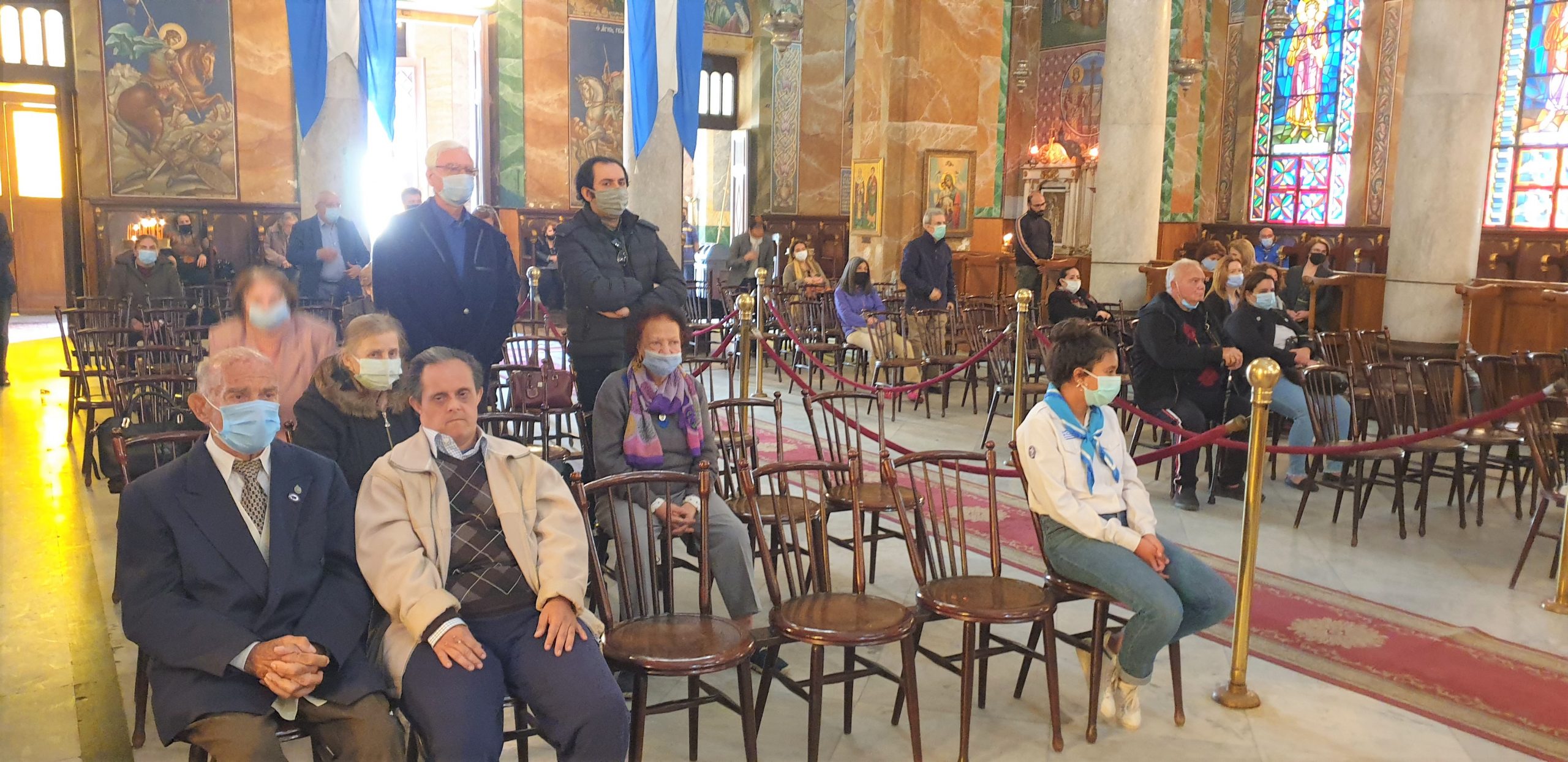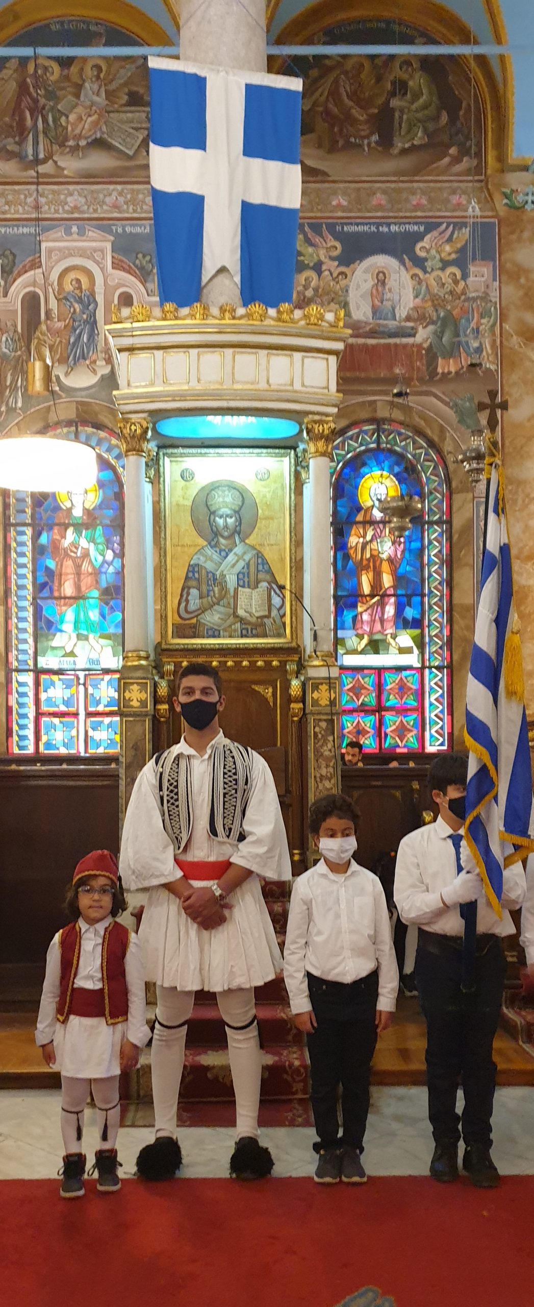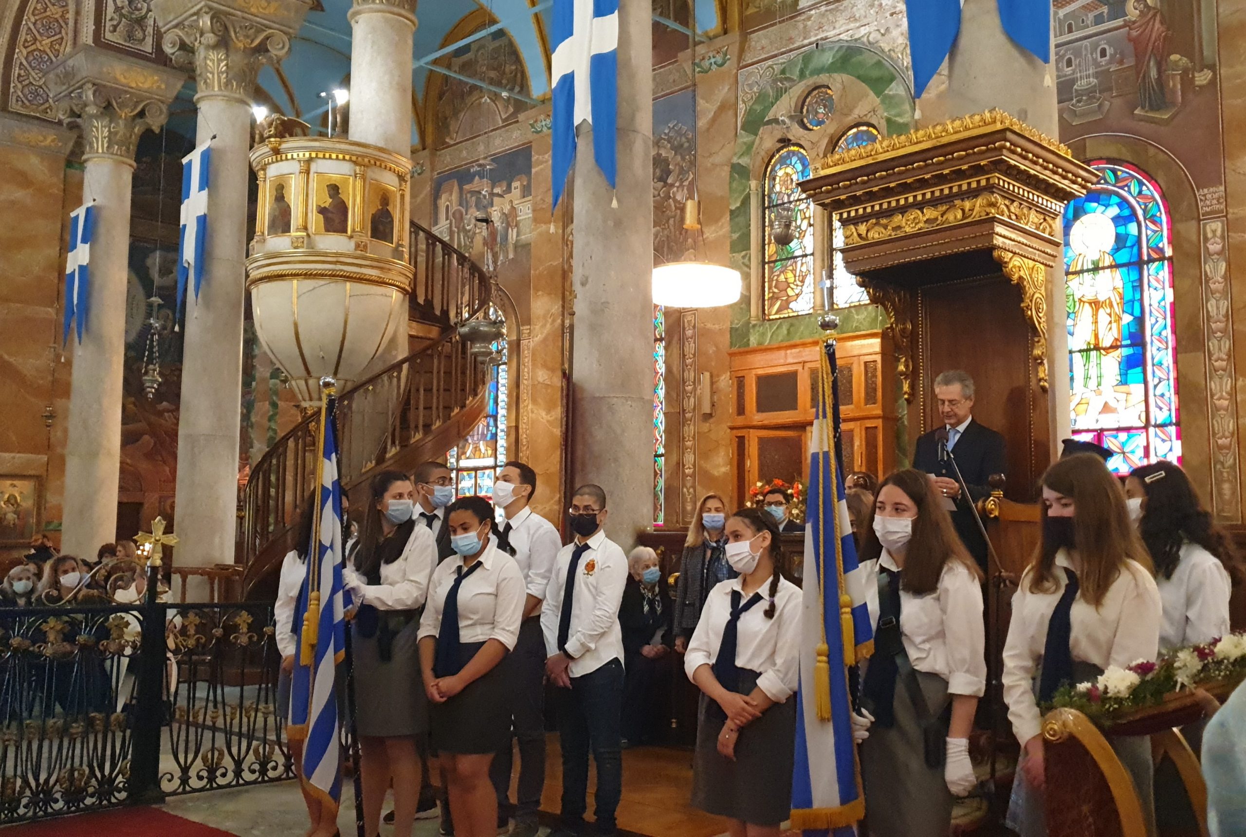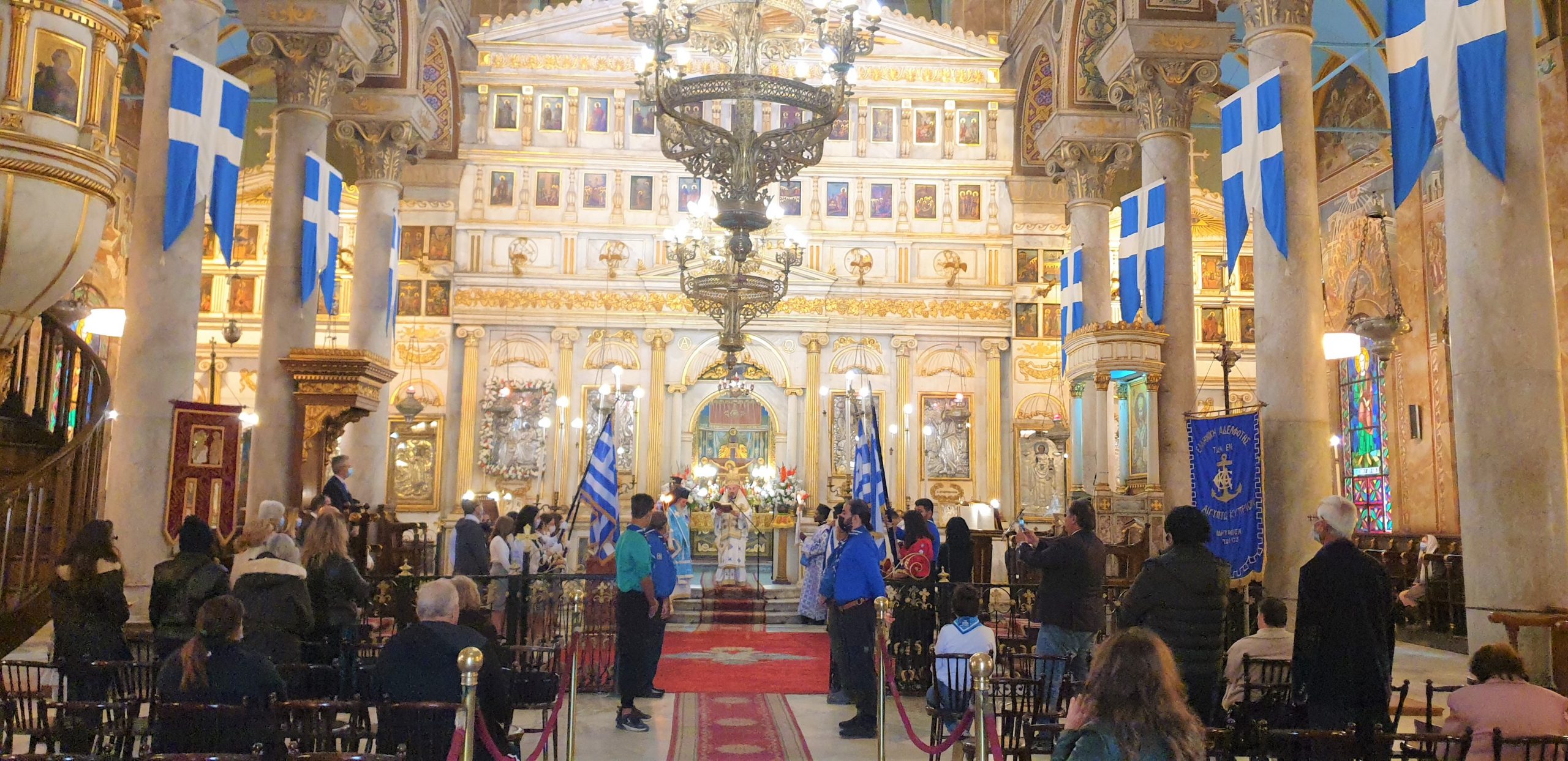Αλλά και όλη η παροικία, με τους μαθητές και τους προσκόπους να σηκώνουν ευλαβικά την γαλανόλευκη μέσα και έξω από τον περικαλλή ναό.