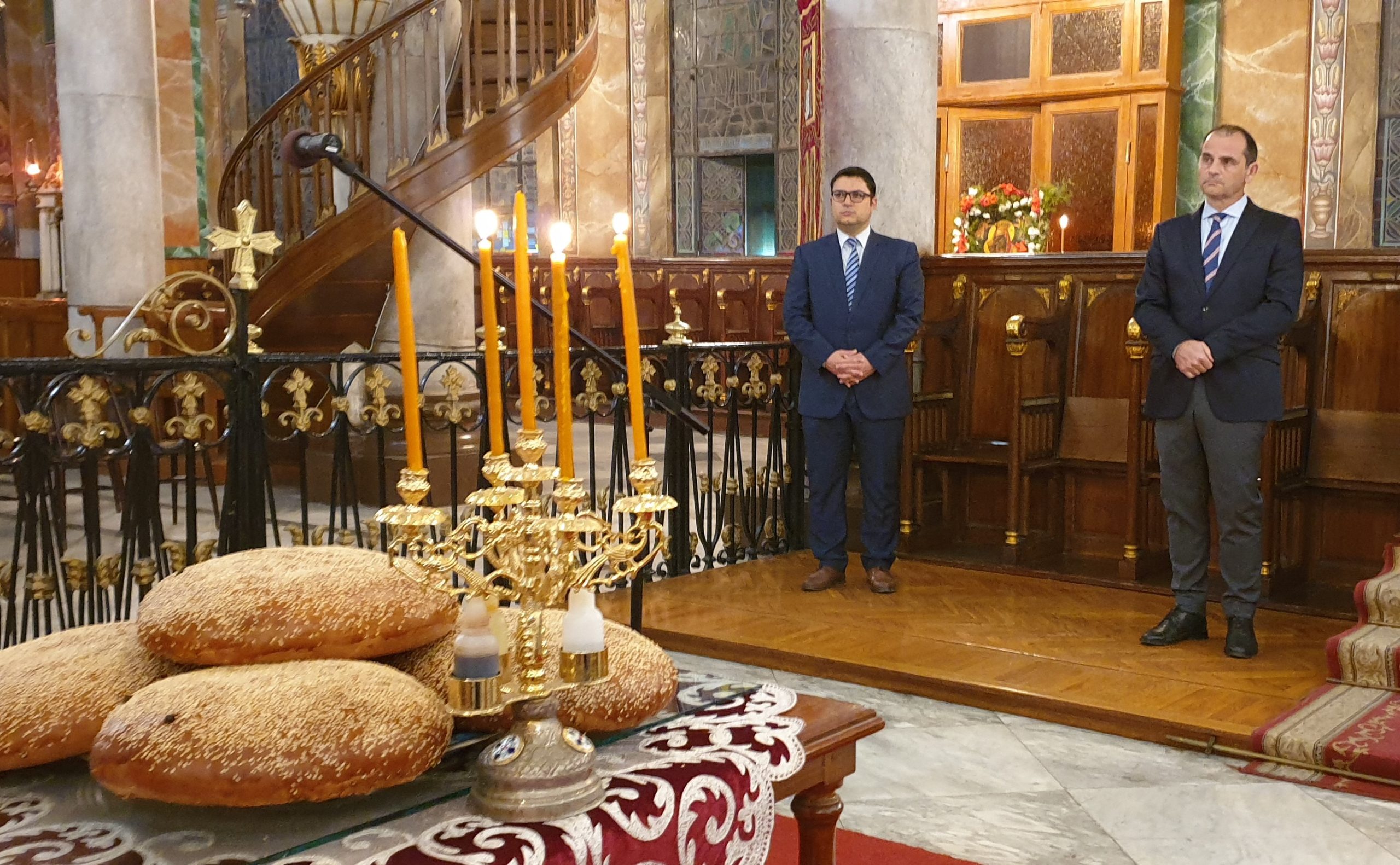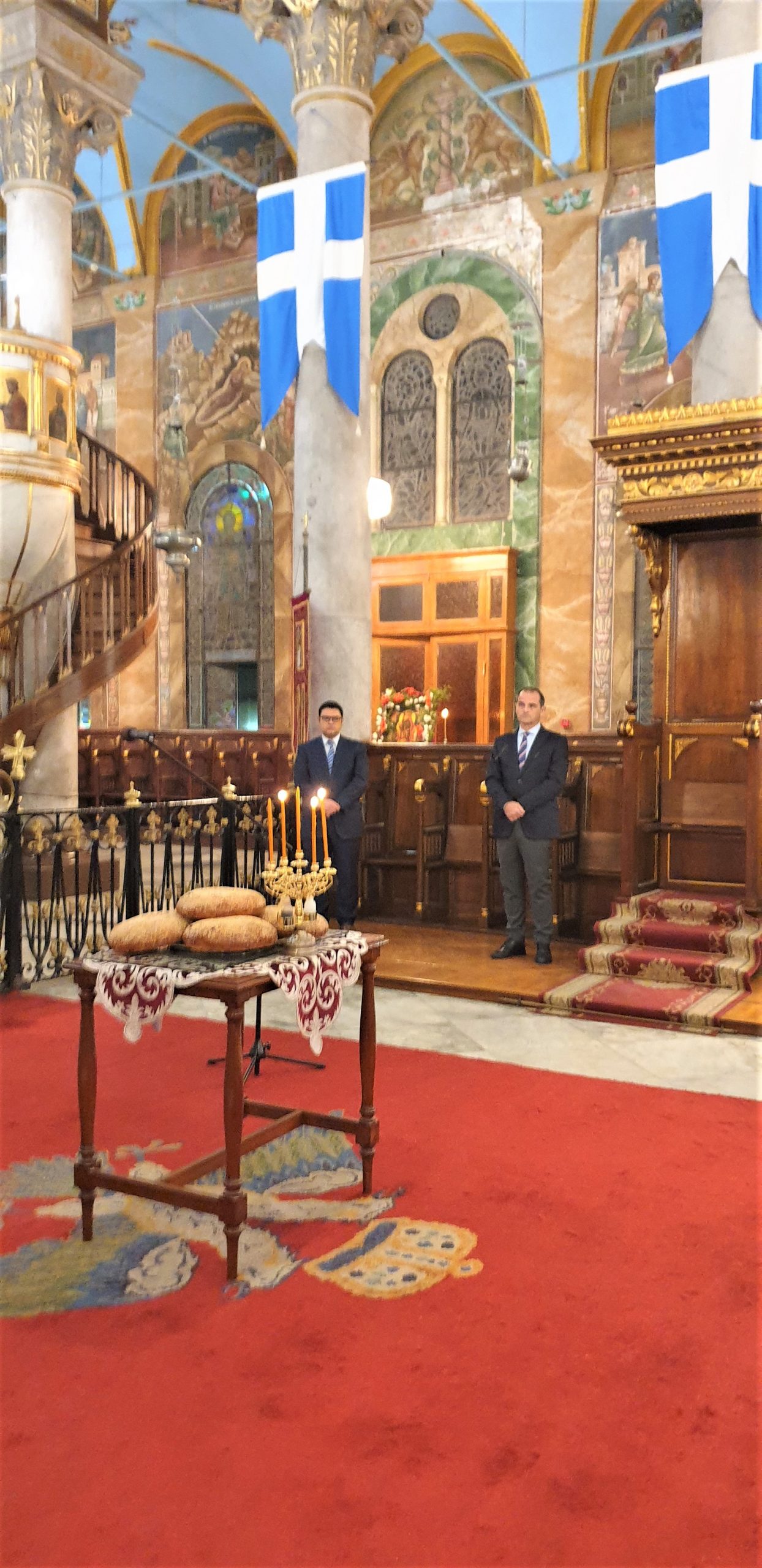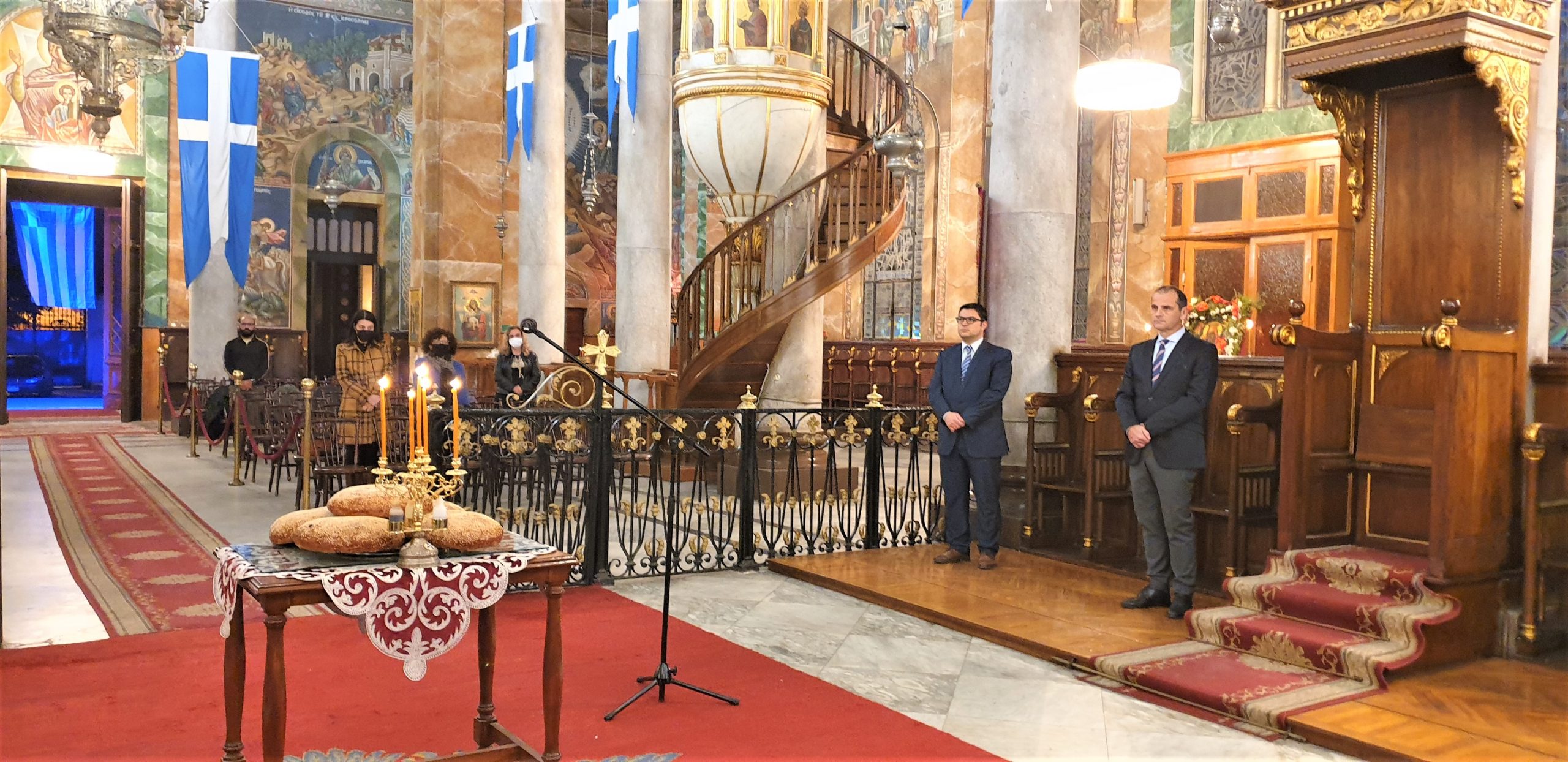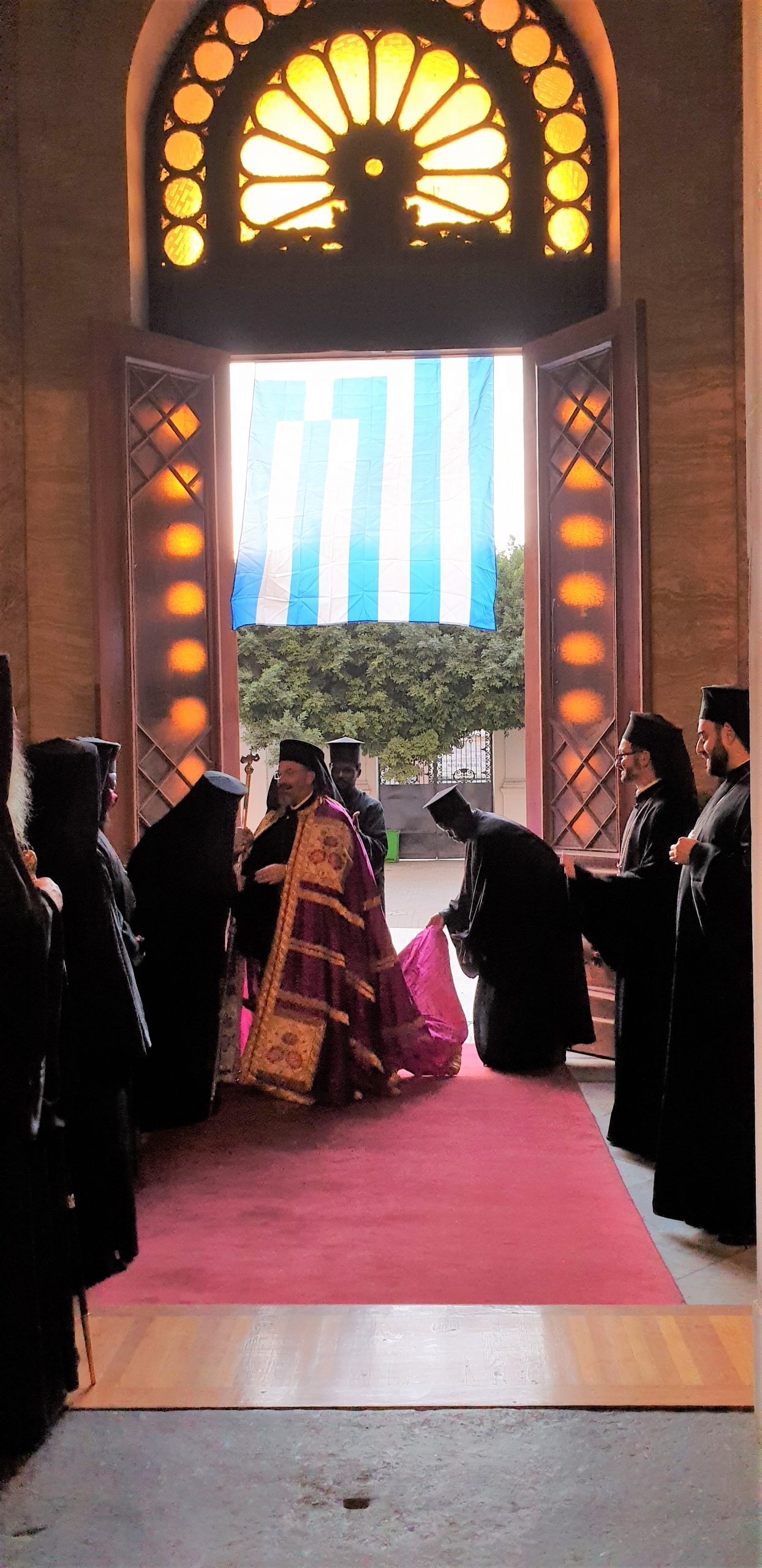 Τέλος, απευθυνόμενος στον Α΄ Αντιπρόεδρο της Ελληνικής Κοινότητας Αλεξανδρείας κ. Ανδρέα Βαφειάδη και τον Γενικό Γραμματέα της ΕΚΑ κ. Δημήτρη Κάβουρα, που εκπροσώπησαν την Κοινοτική Επιτροπή της ΕΚΑ στο μεγάλο αυτό εορτασμό για την εκκλησία και το Έθνος, τους συνεχάρη θερμά για την πρωτοβουλία που είχε η πρεσβυγενής Ελληνική Κοινότητα Αλεξανδρείας να φωτίσει με τα χρώματα της γαλανόλευκης τον περικαλλή ναό του Ευαγγελισμού της Θεοτόκου, για να συμμετάσχει με τον τρόπο αυτό στις εκδηλώσεις της Ελλάδας και των Αποδήμων Ελλήνων για τα 200 χρόνια από την Ελληνική Επανάσταση.