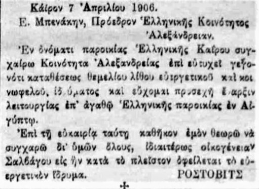 Τα συγχαρητήρια της Ελληνικής Κοινότητας Καΐρου μετέφερε στις 7 Απριλίου του 1906, ο τότε Πρόεδρος της ΕΚΚ, Αλέξανδρος Ρόστοβιτς, προς τον Πρόεδρο της Ελληνικής Κοινότητας Αλεξανδρείας Εμμανουήλ Μπενάκη, με αφορμή την ιστορική θεμελίωση της Σαλβαγείου Επαγγελματικής Σχολής.
