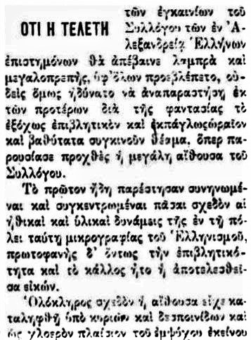 Η εκδήλωση έγινε και ήταν λαμπρή, καθώς διαβάζουμε το ρεπορτάζ που έγραφε η αλεξανδρινή εφημερίδα δύο μέρες αργότερα, στις 13 Απριλίου του 1909.