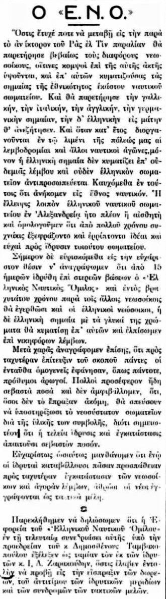 «Σήμερον δε, ευρισκόμεθα εις την ευχάριστον θέσιν να αναγράψωμεν ότι από 15 ημερών (ΣΣ. από της 7ης Απριλίου 1909), ιδρύθη επί στερεών βάσεων ο «Ελληνικός Ναυτικός Όμιλος» και εντός βραχυτάτου χρόνου παρά τοις άλλοις νεωσοίκοις θα εγερθώσι και οι ελληνικοί νεώσοικοι. Η δε ελληνική σημαία με τα γλυκά της χρώματα θα κυματίση επ’ αυτών και ελπίσωμεν επί νικηφόρων λέμβων».