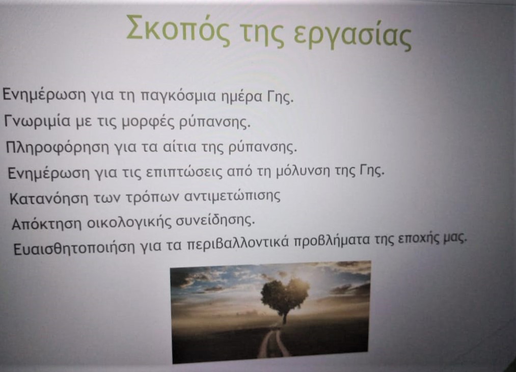 Τέλος, οι μαθητές της Γ΄ Λυκείου σε συνεργασία με την Διευθύντρια κα Κοβατζή ανέβασαν στην ιστοσελίδα του σχολείου ψηφιακό υλικό που στηρίχθηκε σε ερωτηματολόγιο που έδωσαν σ’ όλους τους μαθητές και καθηγητές του σχολείου και μετά το επεξεργάστηκαν, έκαναν στατιστική ανάλυση και έβγαλαν τα δικά τους συμπεράσματα για την προστασία της φύσης και της γης.