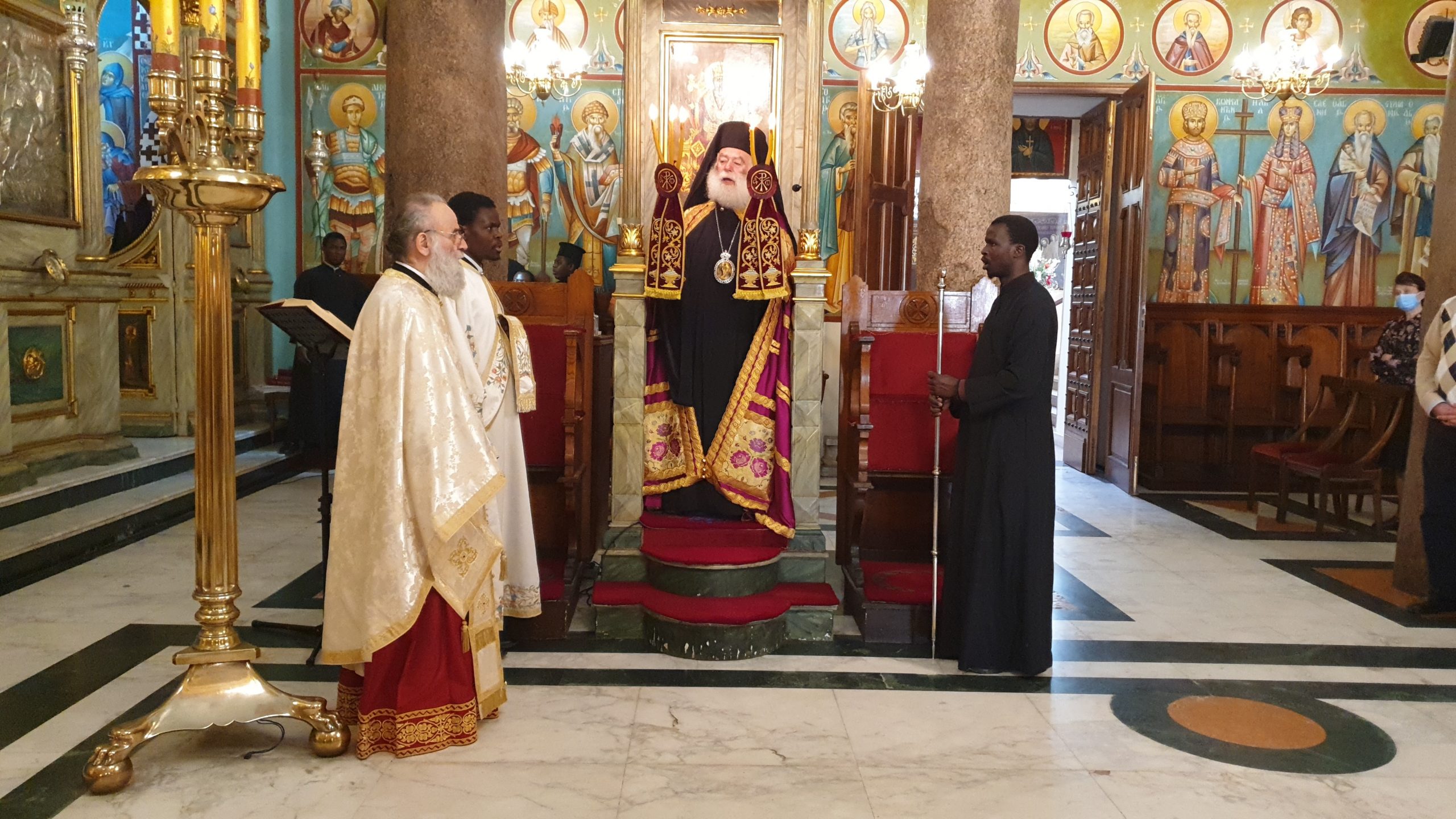 Και από το δεσποτικό της εκκλησίας, ο Πατριάρχης Αλεξανδρείας Θεόδωρος, πλαισιούμενος από τον Πατριαρχικό Επίτροπο Αλεξανδρείας Μητροπολίτη Ναυκράτιδος κ. Νάρκισσο και τον Επίσκοπο Ταμιάθεως κ. Γερμανό, να δηλώνει για τη μεγάλη ημέρα της χριστιανοσύνης: