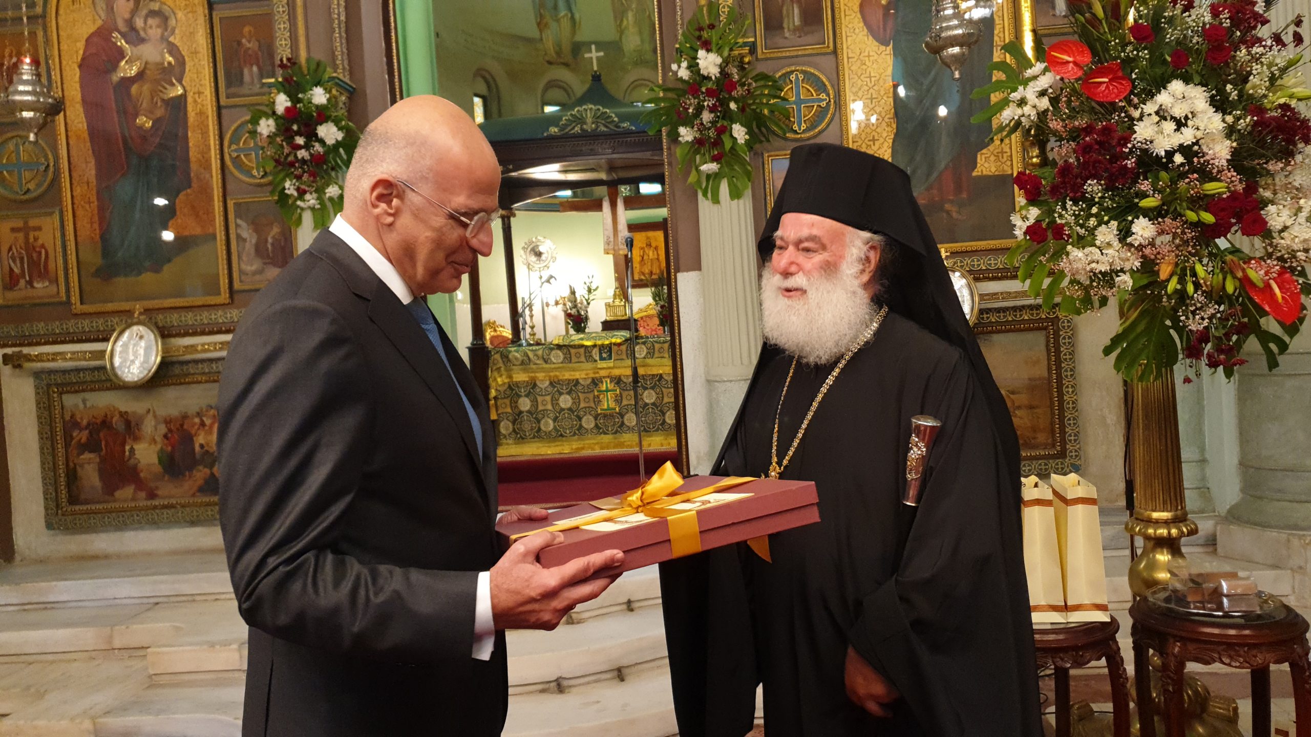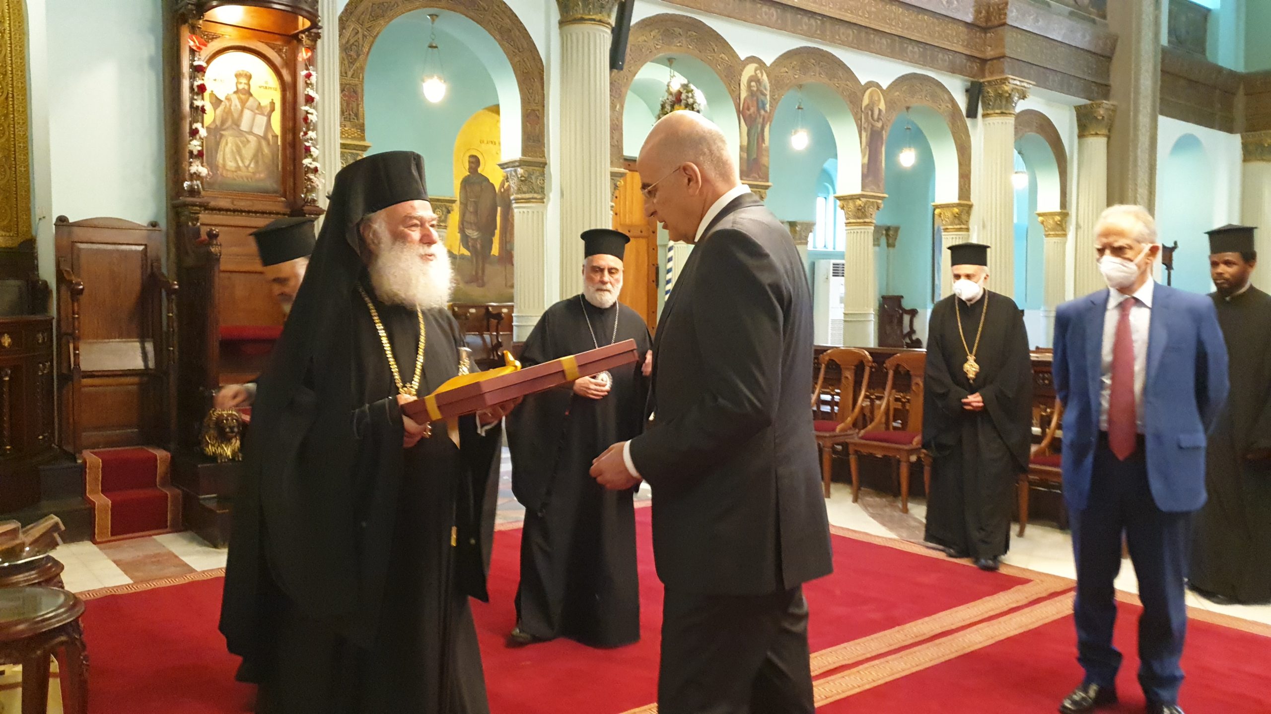 «Καλώς ήλθατε, φίλε Υπουργέ μου και ένα μεγάλο ευχαριστώ που ποτέ δεν μας ξεχνάτε, σε αυτό το μετερίζι που εργαζόμαστε», κατέληξε ο Πατριάρχης Θεόδωρος, προσφέροντας στον Υπουργό Εξωτερικών κ. Δένδια ένα αντίγραφο της ιστορικής εικόνας των Αγίων Κωνσταντίνου και Ελένης, του αιγυπτιώτικου ναού που πανηγυρίζει σήμερα και αύριο στο Κάιρο.