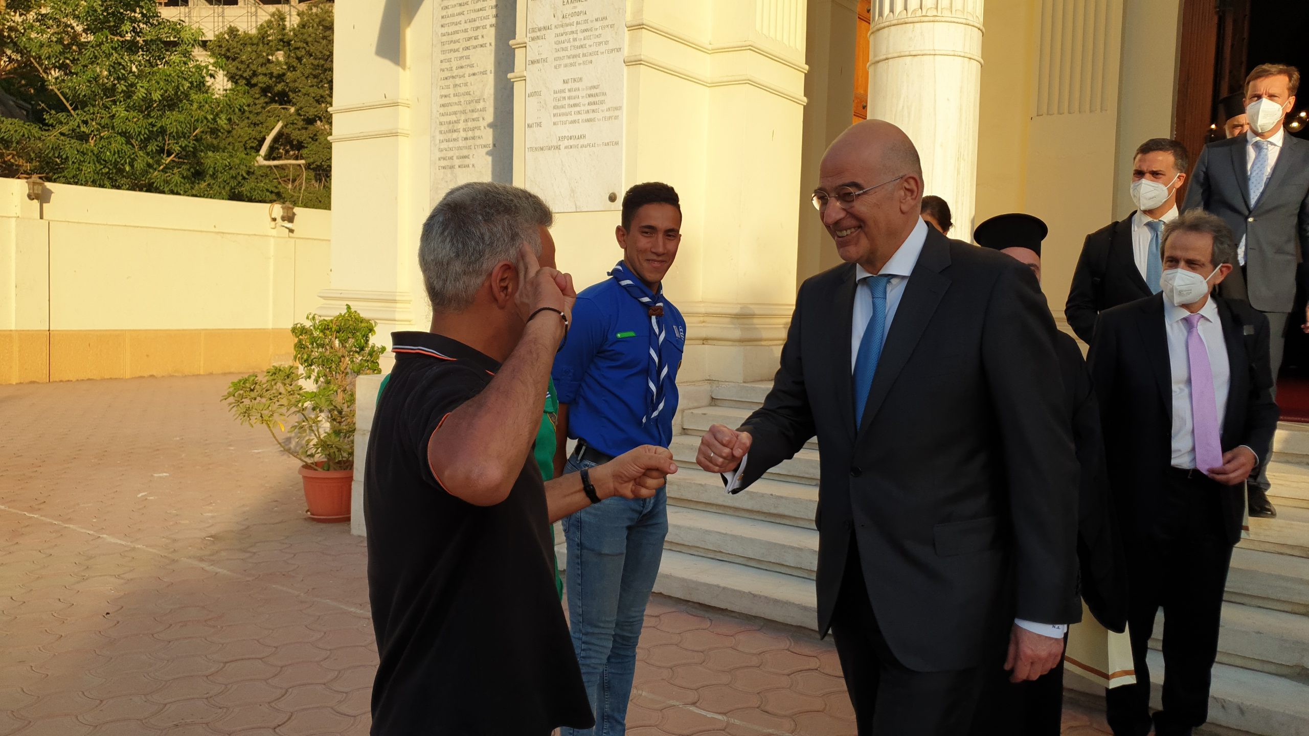 Να σημειωθεί ότι κατά τη συνάντησή τους, ήταν παρόντες η ελληνική αποστολή από την Αθήνα, ο Πατριαρχικός Επίτροπος Καΐρου, Μητροπολίτης Μέμφιδος κ. Νικόδημος, ο Έλληνας Πρέσβης στην Αίγυπτο κ. Νίκος Γαριλίδης, η Γενική Γραμματέας της Ελληνικής Κοινότητας Καΐρου κα Χρυσάνθη Σκουφαρίδου καθώς και Έλληνες Πρόσκοποι που χαιρέτησαν τον Υπουργό Εξωτερικών.