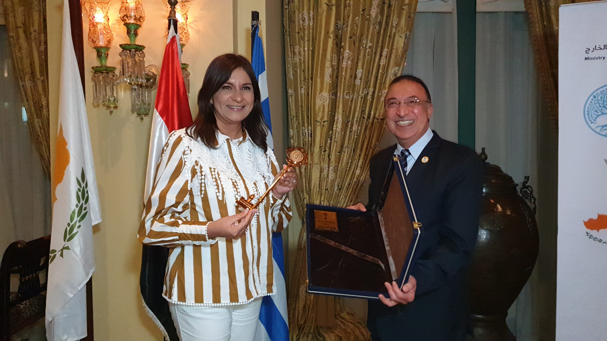 Για το λόγο αυτό, της επιλογής της πόλης που συνδέει με την ιστορία της τις τρεις χώρες, καθώς ιδρύθηκε από τον Μέγα Αλέξανδρο και συνδέθηκε ήδη από τους Ρωμαϊκούς χρόνους με την Πάφο, η Αλεξανδρινή Υπουργός τιμήθηκε από τον Κυβερνήτη της Αλεξάνδρειας Στρατηγό Μοχάμεντ Ελ Σερίφ, ο οποίος της χάρισε το «χρυσό κλειδί» της πόλης.