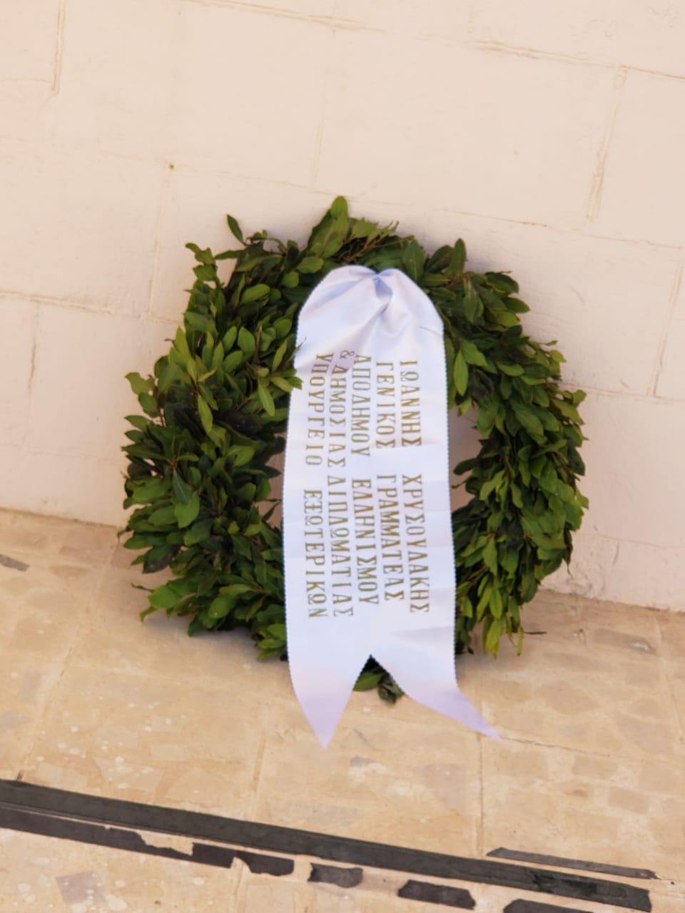 Στην τελετή της κατάθεσης του στεφάνου, παρέστησαν ο Γενικός Πρόξενος της Ελλάδας στην Αλεξάνδρεια κ. Αθανάσιος Κοτσιώνης και ο Γενικός Σύμβουλος Επικοινωνίας της Ελληνικής Πρεσβείας στο Κάιρο κ. Ηλίας Γαλάνης.