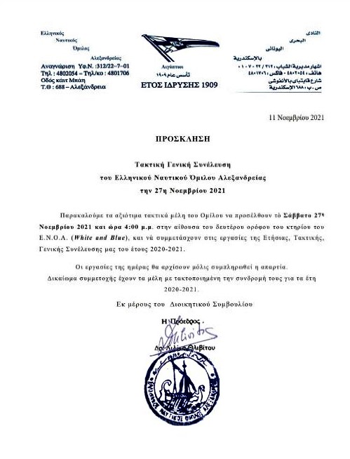 Συγκεκριμένα, σύμφωνα με ανακοίνωση του ιστορικού παροικιακού αθλητικού σωματείου της Αλεξάνδρειας, ο ΕΝΟΑ προσκαλεί «τα αξιότιμα τακτικά μέλη του Ομίλου να προσέλθουν το Σάββατο 27 Νοεμβρίου 2021 και ώρα 4:00 μ.μ. στην αίθουσα του δευτέρου ορόφου του κτιρίου του Ε.Ν.Ο.Α. (White and Blue) και να συμμετάσχουν στις εργασίες της Ετήσιας, Τακτικής, Γενικής Συνέλευσης του έτους 2020-2021».