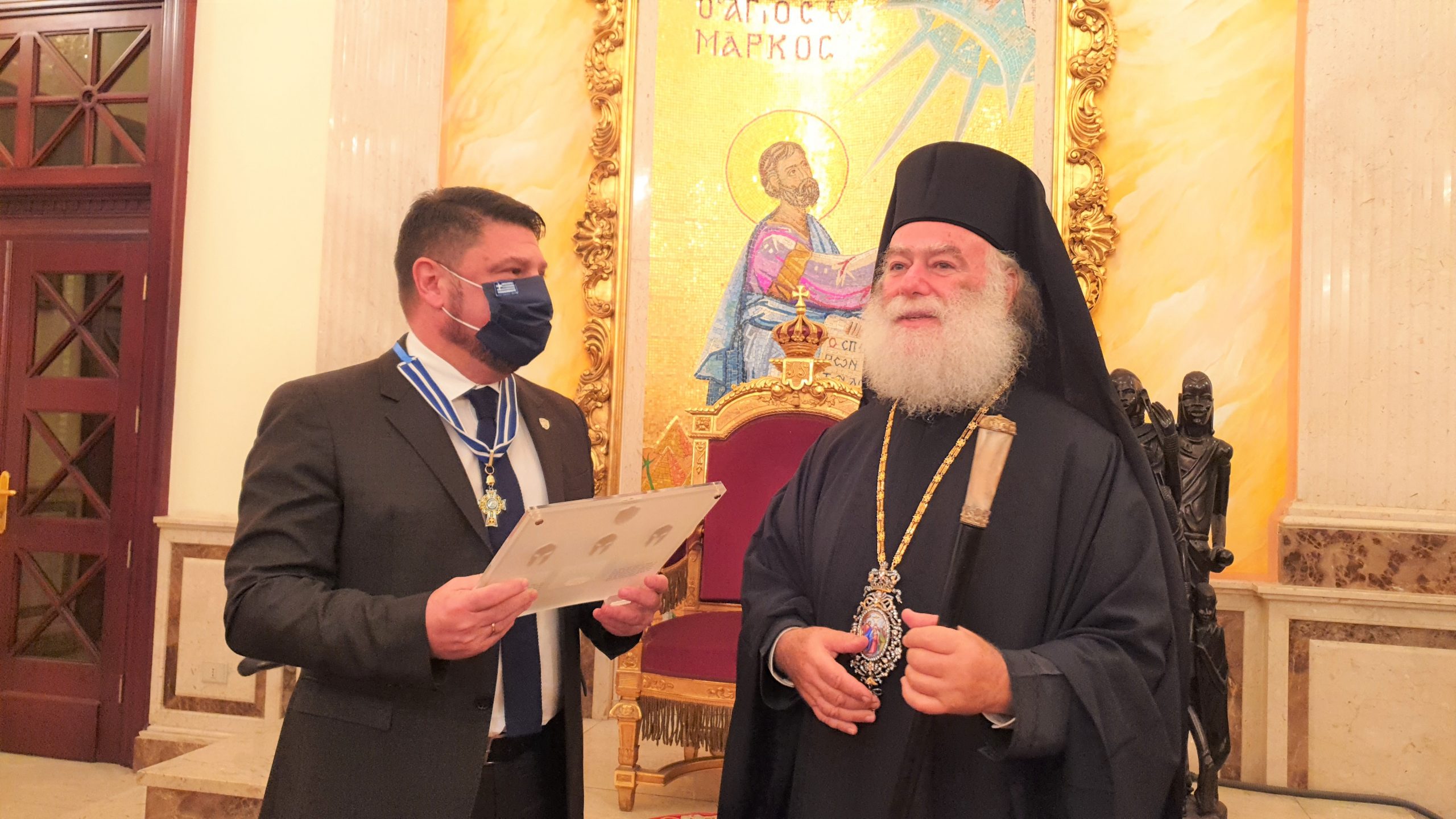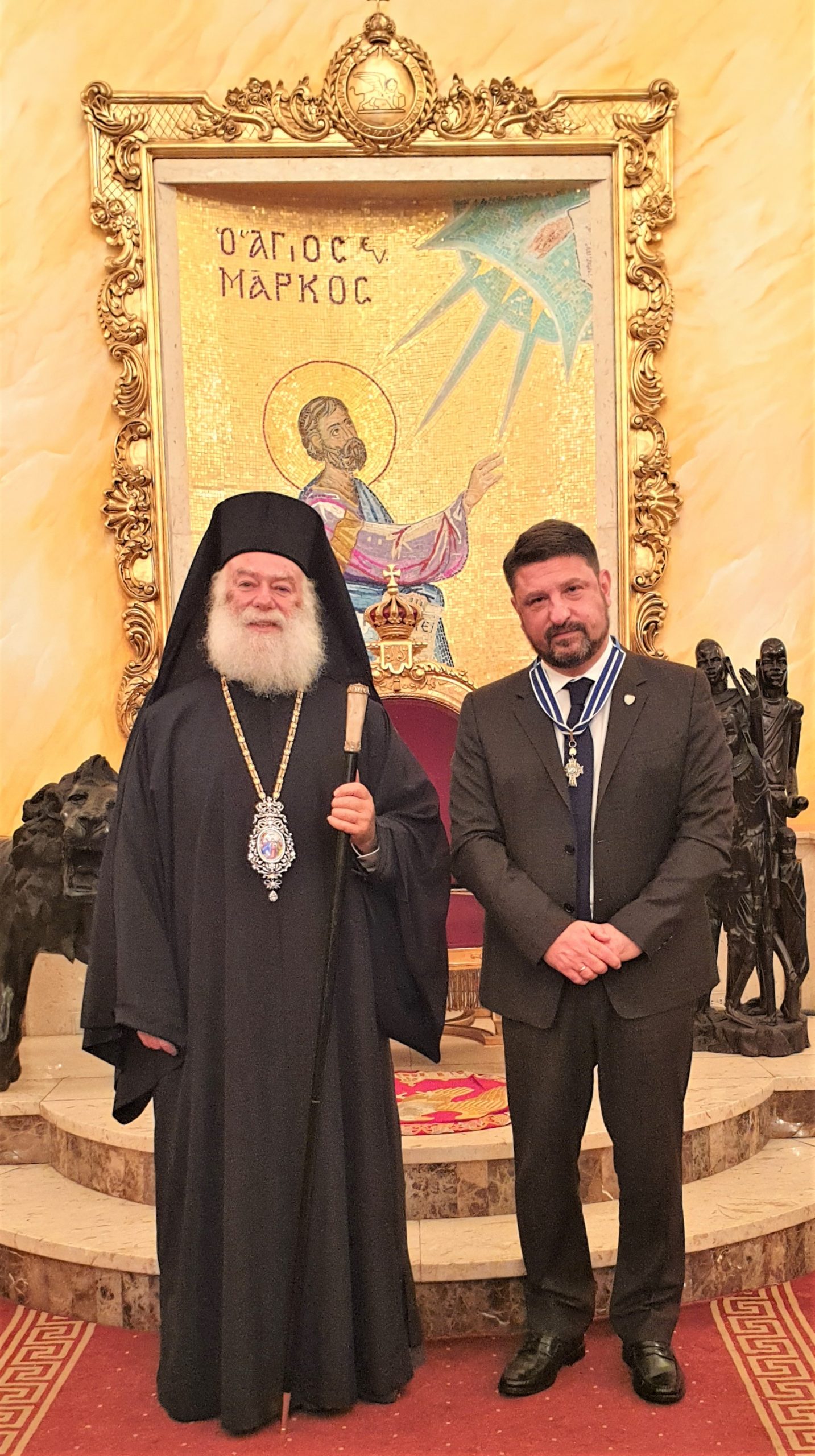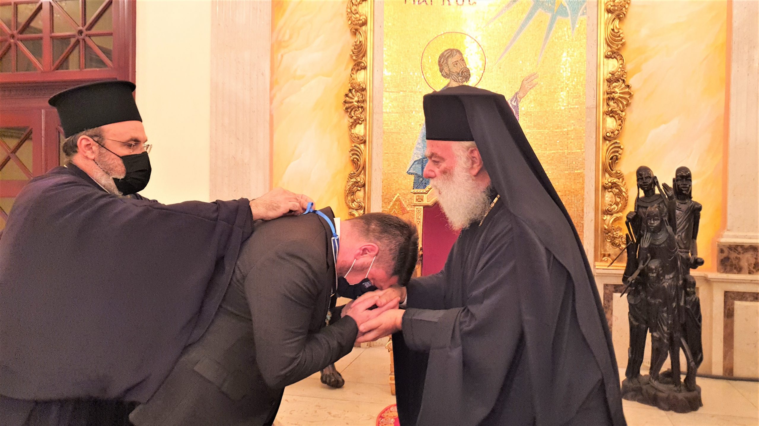 Μία ξεχωριστή τιμητική διάκριση επεφύλαξε ο Πατριάρχης Αλεξανδρείας και πάσης Αφρικής κ.κ. Θεόδωρος στον Υφυπουργό Εθνικής Άμυνας, Νίκο Χαρδαλιά, προσφέροντάς του τον Σταυρό του Αποστόλου και Ευαγγελιστού Μάρκου, εκφράζοντας σε κλίμα συγκίνησης την προσωπική του ευγνωμοσύνη, αλλά και όλης της Ορθόδοξης Εκκλησίας της Αφρικής, για τους αγώνες του για τον άνθρωπο που κατέβαλε εναντίον του κορονοϊού και των πολλών θεομηνιών που έπληξαν την Ελλάδα τους τελευταίους 26 μήνες.