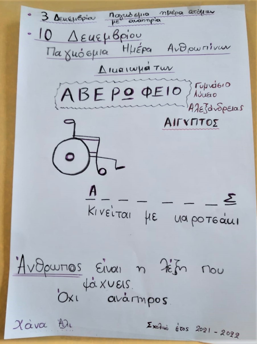 Σε μία σημαντική διαδικτυακή εκδήλωση που ένωσε Έλληνες μαθητές από την Ελλάδα, την Αίγυπτο και την Γερμανία, ευαισθητοποιώντας τους στην Παγκόσμια Ημέρα Ατόμων με Αναπηρία, συμμετείχαν στις 13 Δεκεμβρίου οι μαθητές του Αβερωφείου Γυμνασίου και Λυκείου της Ελληνικής Κοινότητας Αλεξανδρείας.