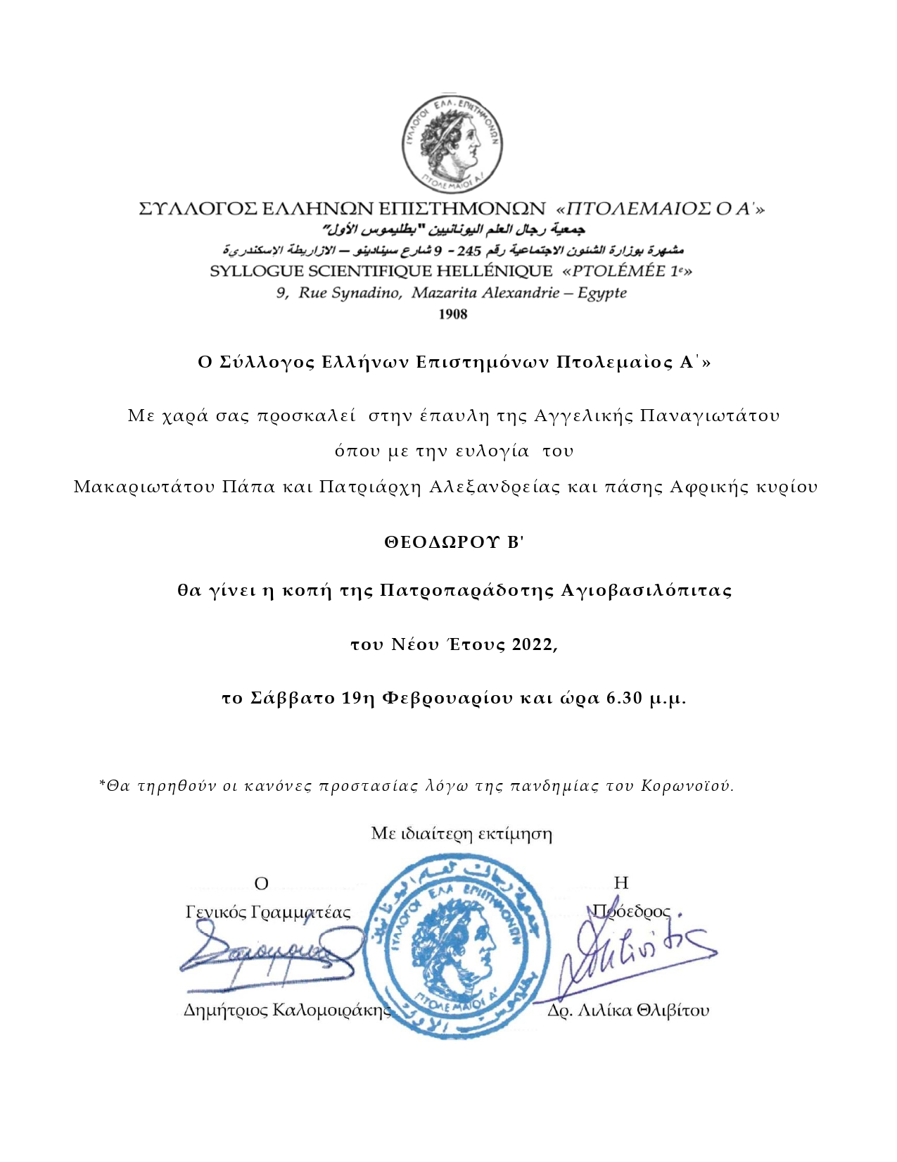 Πρόσκληση για την κοπή της Αγιοβασιλόπιτας του Συλλόγου Ελλήνων Επιστημόνων ΠΤΟΛΕΜΑΙΟΣ ο Α’
