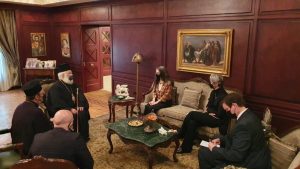 Tην αναπληρώτρια Πρέσβη των Η.Π.Α στο Κάιρο Nicole Shampaine, καθώς και τον Υπουργό Δημοσίων σχέσεων της Πρεσβείας κ. Lauren Lovelace, υποδέχθηκε σήμερα, 2α του μηνός Μαρτίου 2022, η Α.Θ.Μ., ο Πάπας και Πατριάρχης Αλεξανδρείας και πάσης Αφρικής κ.κ. Θεόδωρος B’, παρουσία του Πατριαρχικού Επιτρόπου Αλεξανδρείας, Σεβ. Μητροπολίτου Πηλουσίου κ. Ναρκίσσου και του Θεοφιλ. Επισκόπου Νιλουπόλεως κ. Νικοδήμου.